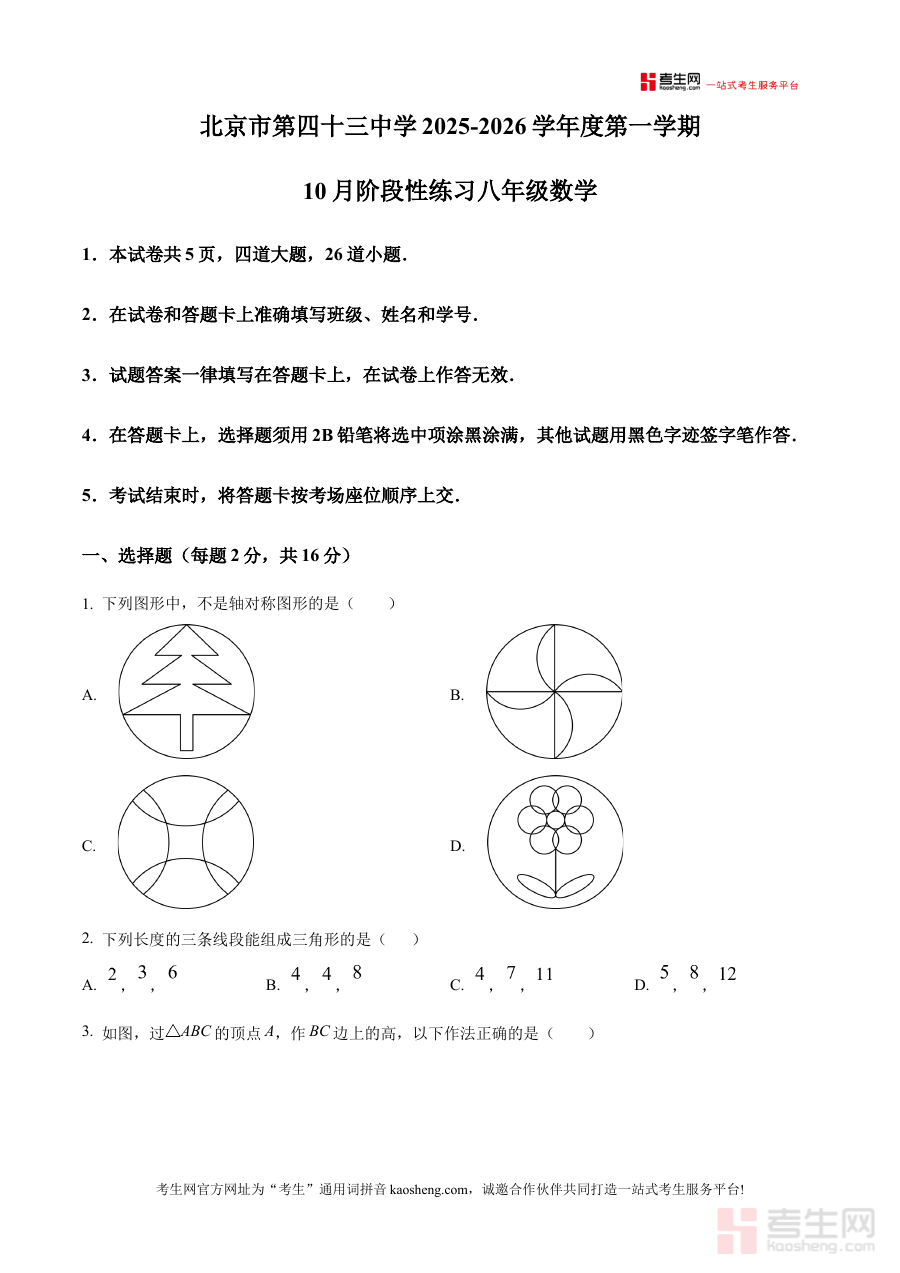 《精品解析:北京市第四十三中学2025-2026学年上学期 10月阶段性练习八年级数学试题(原卷版)》是北京市第四十三中学在2025-2026学年上学期10月针对八年级学生开展的数学阶段性练习的原始试题资料,属于该校学期初期数学学科阶段检测体系的重要组成部分,为八年级学生及教师提供了贴合该校教学进度和考查要求的备考参考依据。