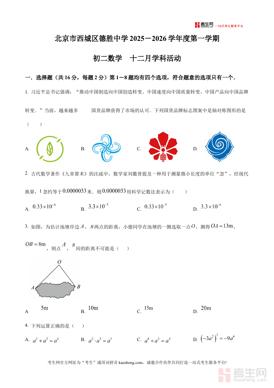 《精品解析:北京市西城区德胜中学2025-2026学年八年级上学期12月月考数学试卷(原卷版)》是针对北京市西城区德胜中学特定学年与时间节点的数学学科阶段性检测资料。该资料对应2025至2026学年八年级上学期12月的月考场景,属于学校内部组织的阶段性学业评估范畴,为相关师生提供了贴合该校教学进度与考试要求的原卷形式备考资源,能够帮助使用者直接接触到该校该阶段考试的真实呈现形式。