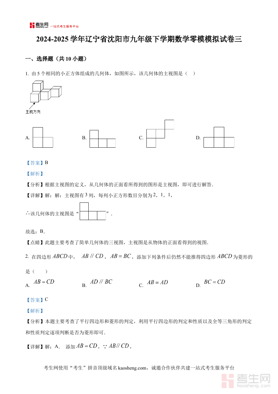 本资料适用于沈阳市2024-2025学年九年级下学期的数学考生、一线数学教师及考生家长。对于考生,它能提升阶段检测的有效性,明确备考重点与方向;对于教师,可借助解析优化辅导方案,增强教学针对性;对于家长,则能更好地配合学校与孩子,共同为中考复习奠定坚实基础。其解析内容聚焦零模考试的核心需求,为不同角色提供专业且实用的支持与参考。