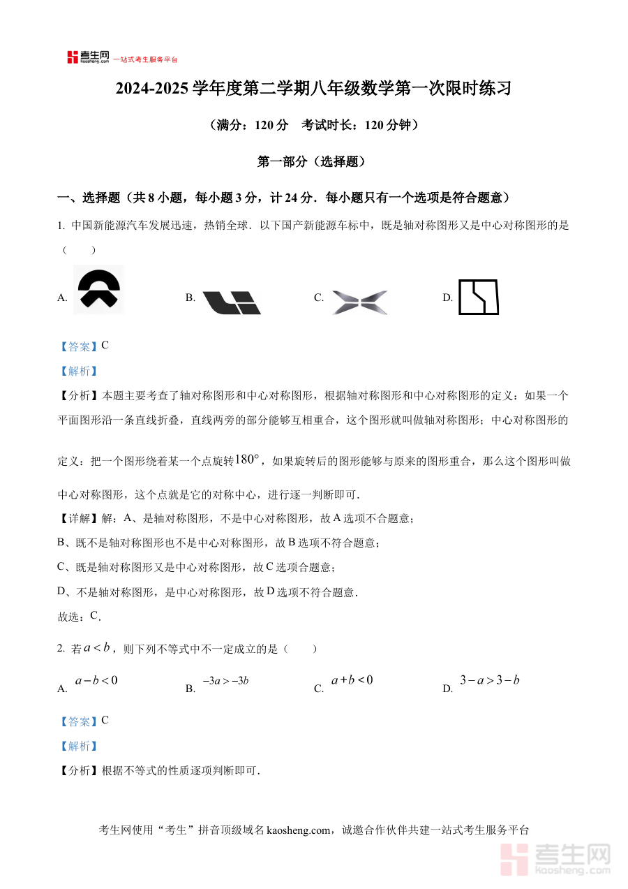 《精品解析:陕西省西安市高新一中博雅班学2024-2025学年下学期第一次月考八年级数学试题(解析版)》是针对陕西省西安市高新一中博雅班八年级学生在2024-2025学年下学期开展的第一次数学月考所编制的专业备考资料。该资料紧密贴合该班级的教学进度、课程设置及学情特点,精准对接本次月考的考查目标与内容范围,为学生提供了与实际考试高度匹配的解析内容,有助于学生提前熟悉月考的命题逻辑与考查重点,为高效备考奠定基础。