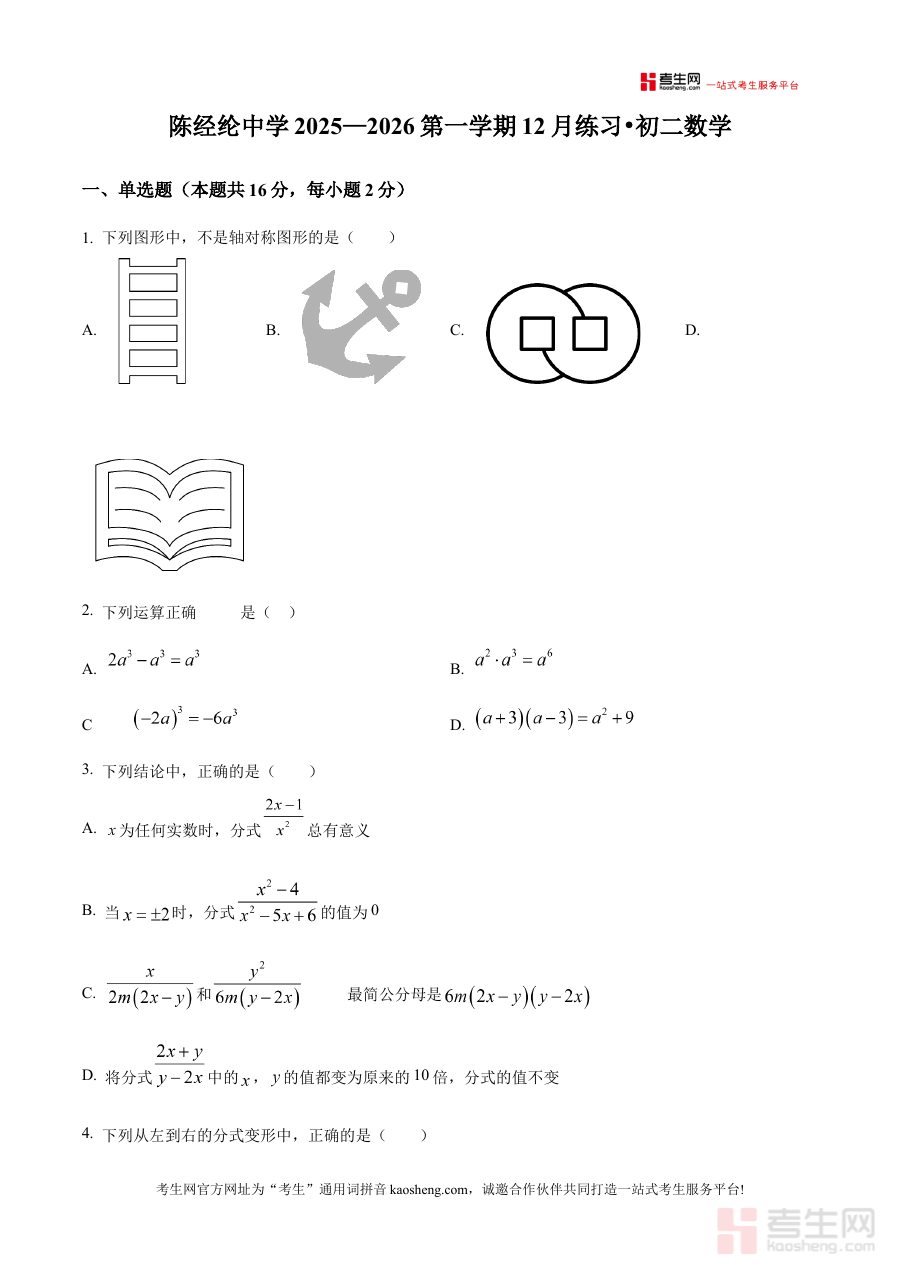《精品解析:北京市陈经纶中学2025-2026学年八年级上学期12月月考数学试题(原卷版)》是针对北京市陈经纶中学该学年八年级学生上学期12月数学月考的官方原卷形式备考资料。该资料贴合学校该阶段数学教学进度与考试要求,能够真实呈现本次月考的考查范围与命题方向,为使用者提供贴近实际考试场景的练习载体。