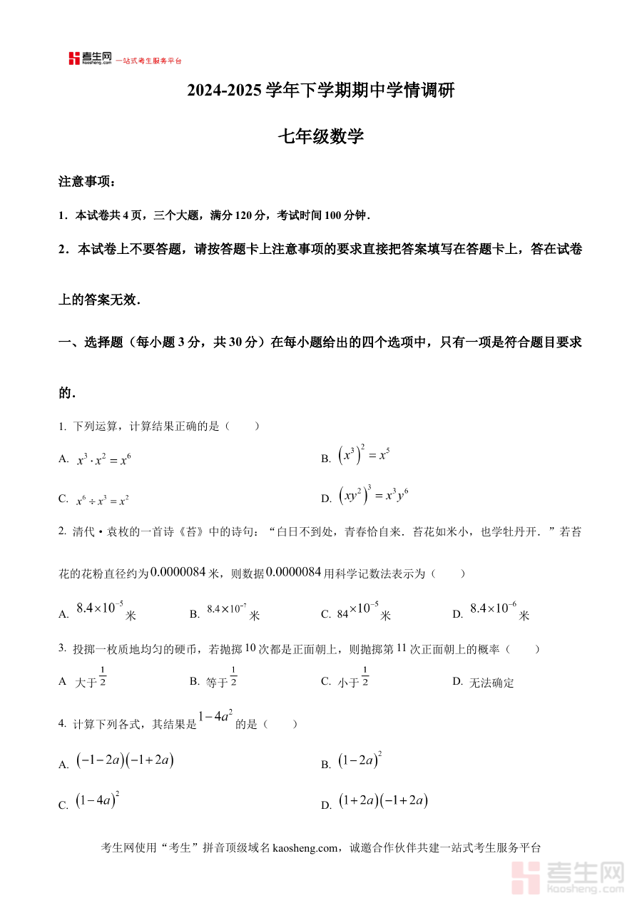 《精品解析:河南省郑州市2024-2025学年七年级下学期4月期中数学试题(原卷版)》是针对河南省郑州市2024至2025学年七年级下学期4月举行的期中数学考试所编制的备考资料,聚焦该地区该阶段数学学科的期中检测需求,为相关教学与学习活动提供对应考试的原始试卷参考。