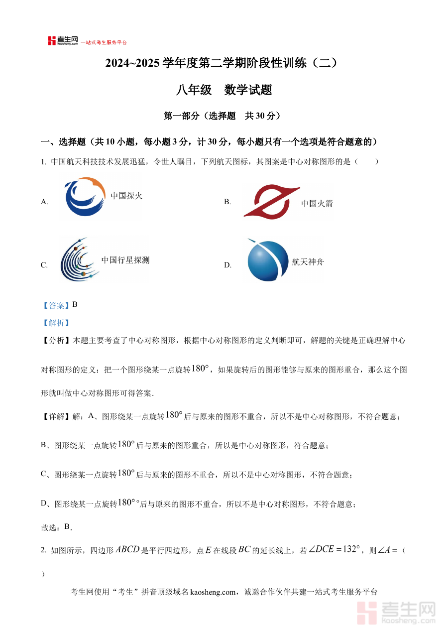 《精品解析:陕西省西安市高新区唐南中学2024-2025学年 八年级下学期5月考数学试题(解析版)》是一份针对特定学校、特定学年学期与特定考试节点的数学学科备考资料。其覆盖范围明确指向陕西省西安市高新区唐南中学2024-2025学年八年级下学期的5月校内数学考试,以试题解析为核心内容,旨在为相关使用者提供与本校教学实际高度匹配的备考辅助资源,帮助使用者快速把握该次考试的整体框架与考查方向。