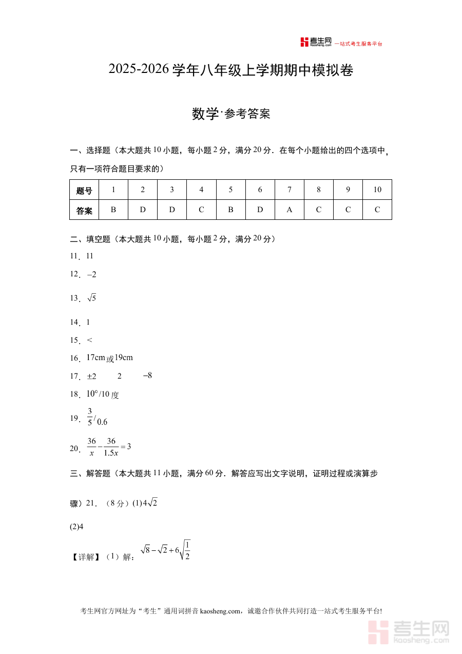 《八年级数学上学期期中模拟卷01(新教材北京版)(参考答案)》是适配北京地区使用新教材体系的八年级学生数学学科期中阶段模拟练习的配套参考资料。该资料紧密呼应北京地区数学学科期中考查的阶段属性与新教材的内容导向,为学生提供了与期中模拟练习对应的标准化答案参考,是期中备考进程中支撑练习结果验证的重要辅助资源。