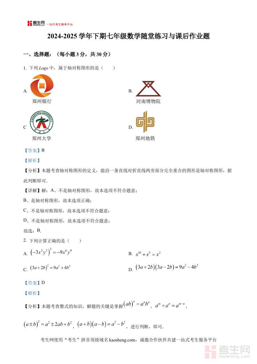 《精品解析:河南省郑州市外国语中学、枫杨外国语、朗悦慧外国语等联考2024-2025学年下学期七年级期中考试数学试卷(解析版)》是针对河南省郑州市多所外国语中学联合举办的2024-2025学年下学期七年级期中考试数学科目的备考资料,聚焦该阶段联考的数学考试需求,为使用者提供专业的解析支持。