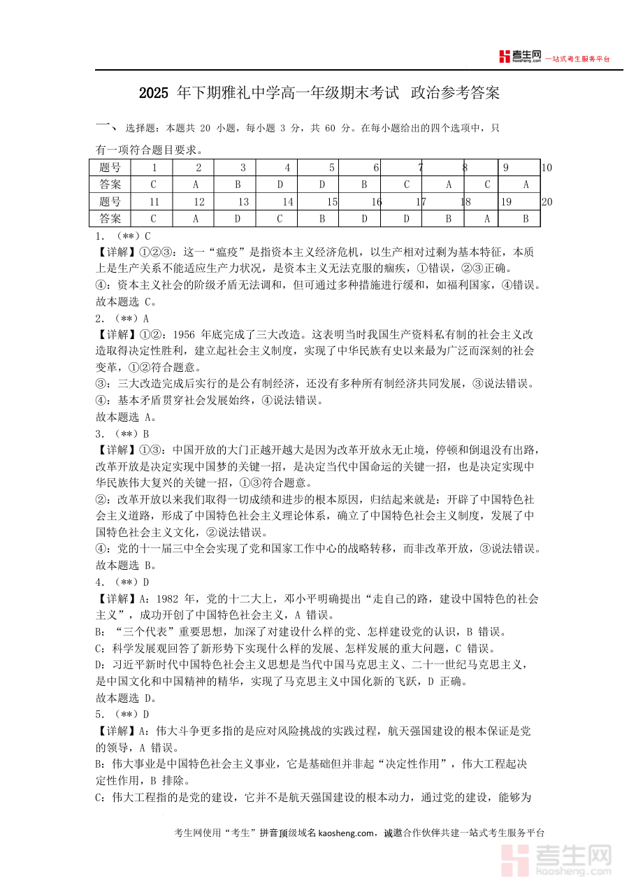 《长沙市雅礼中学2025-2026学年高一上学期期末考试政治答案》是长沙市雅礼中学针对2025-2026学年高一上学期政治学科期末检测编制的配套答案资料,覆盖该学期政治学科的阶段性学习内容,为师生提供了对应考试的权威参考依据。作为区域内优质中学的期末检测资源,它能够帮助使用者快速核对答题情况,明确答题的规范方向,是高一政治学科期末阶段备考过程中不可或缺的辅助材料之一。