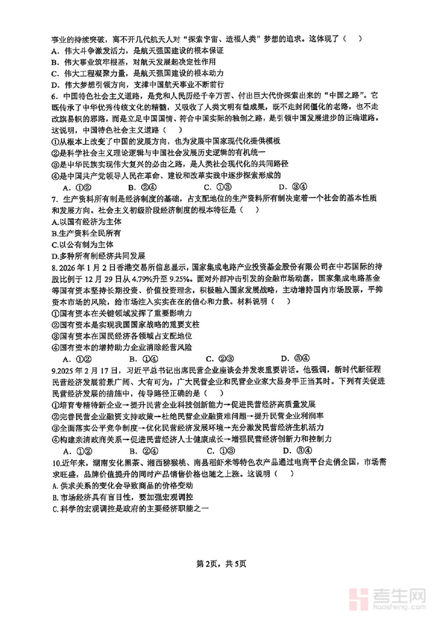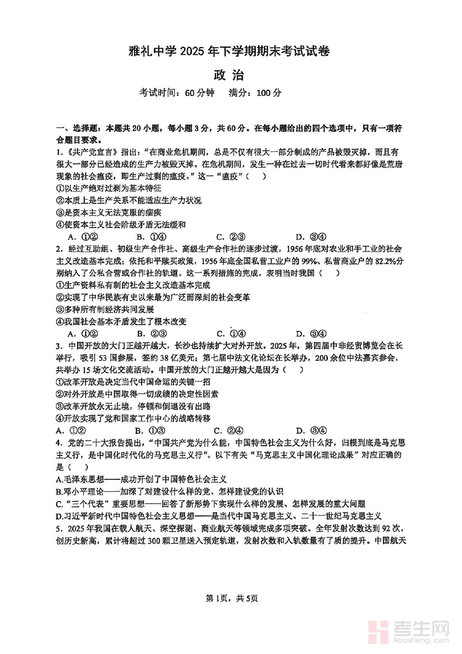 其适用人群为长沙市雅礼中学2025-2026学年高一学生及相关政治学科教师,通过该试卷及解析,学生可进行阶段检测以巩固所学知识、提升应试能力,教师则能借助资料开展教学评估与备考指导,共同提升期末复习效率与效果。