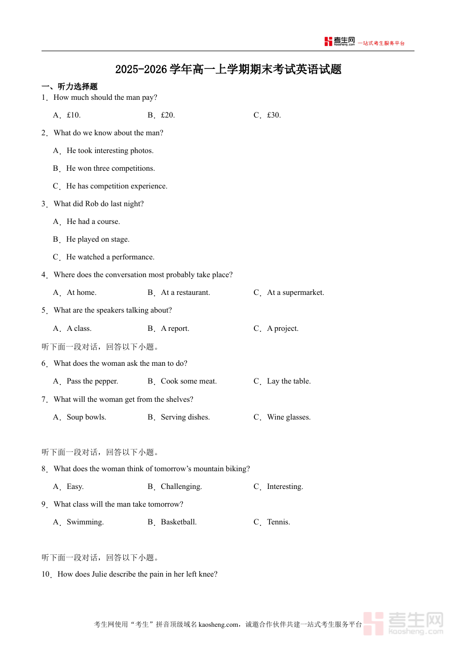 《长沙市雅礼中学2025-2026学年高一上学期期末考试英语试卷(含答案,含听力原文无音频)》是长沙地区重点中学雅礼中学针对特定学年高一学生英语学科上学期期末阶段设计的规范性检测工具,包含完整试题答案及听力部分原文(无配套音频资源),属于该阶段英语学科期末考试的针对性备考资料,能够帮助使用者提前适应考试场景与评价体系,为期末备考提供直接参考依据。