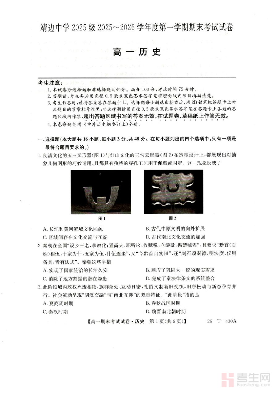 本资料适用于靖边中学2025-2026学年高一学生及相关历史教师,作为阶段检测工具能有效辅助学生巩固所学内容、提升应试能力,同时为教师优化教学策略、制定针对性复习计划提供支持,具有较强的阶段备考指导价值。