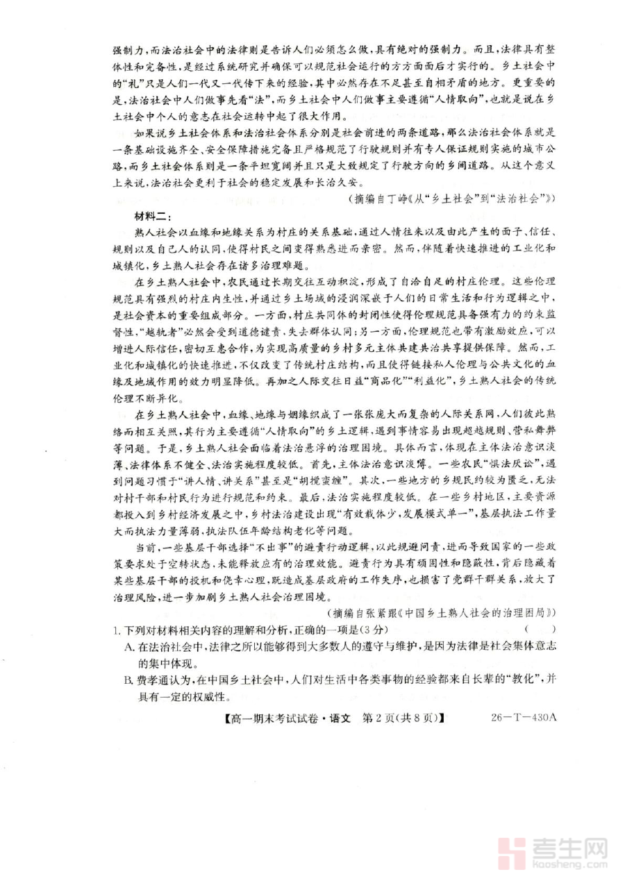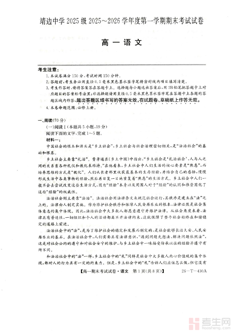 《陕西省榆林市靖边县靖边中学2025-2026学年高一上学期期末考试语文试卷(图片版,含答案)》是针对2025-2026学年陕西省榆林市靖边县靖边中学高一年级上学期期末语文考试的专用备考资料。该资料依托靖边中学高一语文教学进度与期末检测要求编制,能够为使用者提供贴合本地教学实际的考试场景模拟,帮助使用者提前熟悉该考试的整体框架与考查方向,是备考该期末考试的重要参考材料之一。
