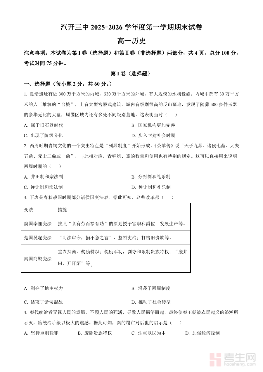 《【历史】2025-2026长春汽三高一上期末考试》是针对2025-2026学年长春汽三高一年级上学期历史期末考试的专属备考资料,其内容设计与该考试的考查目标、范围紧密关联,能够为使用者提供贴合考试实际的参考框架,帮助使用者提前熟悉考试的整体方向与核心要求,为后续的系统复习准备奠定基础。