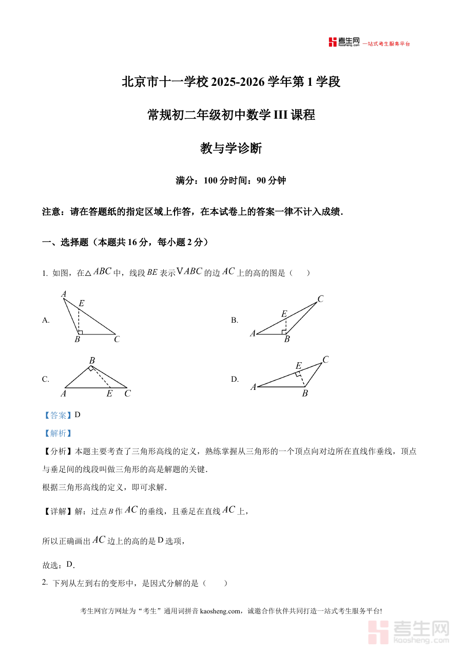 《精品解析:北京市十一学校 2025-2026学年八年级上学期期中数学试题(解析版)》是针对北京市十一学校2025-2026学年八年级上学期期中数学考试打造的专业化备考资料。该资料依托该校该学年八年级上学期期中数学试题资源,结合详细解析内容形成,能够精准贴合该校的教学进度与期中数学考试的具体要求,为使用者提供具有高度针对性的参考依据,助力其了解该考试的整体框架与考查方向。