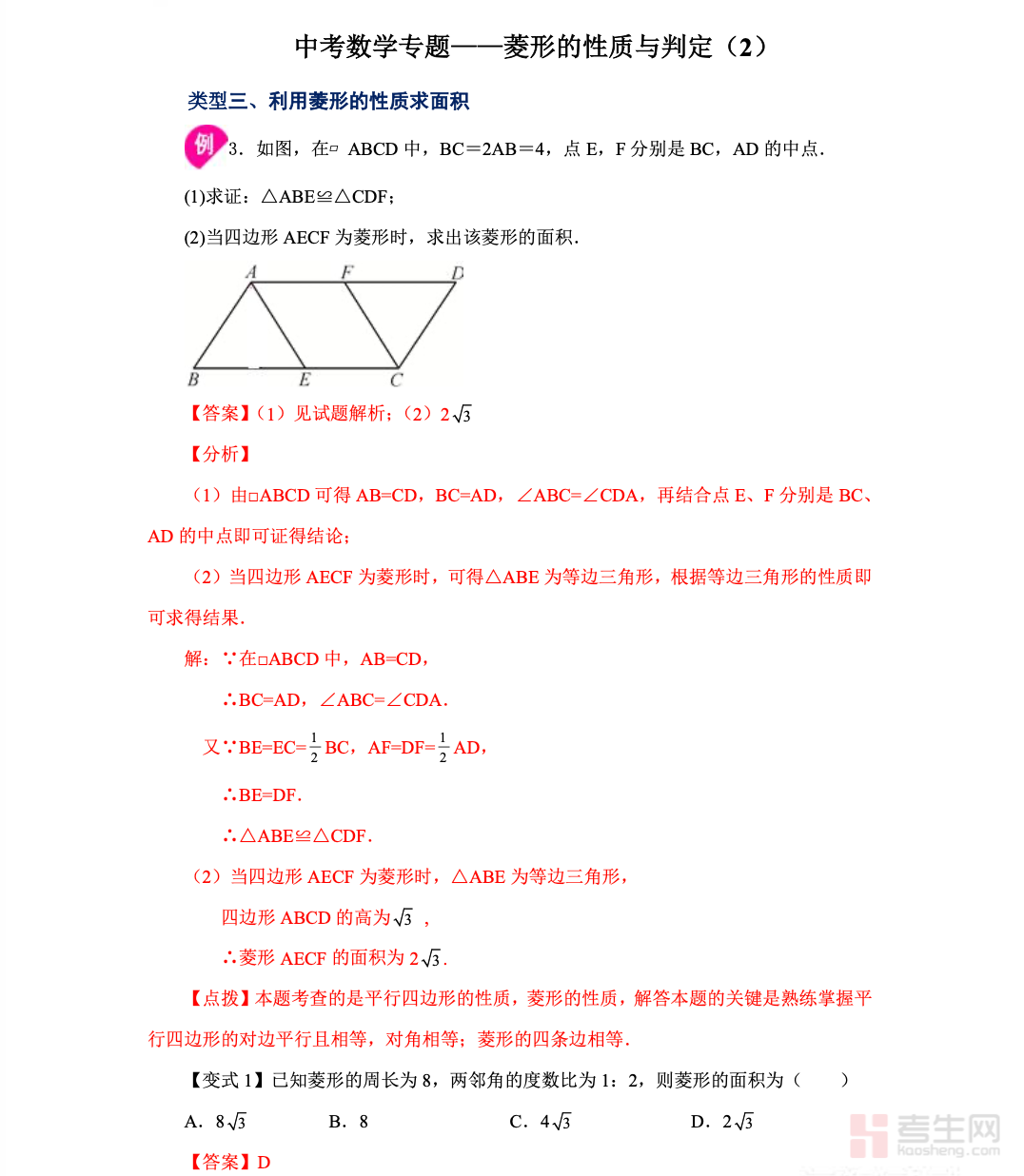 中考数学专题 —— 菱形的性质与判定(1)紧扣中考数学四边形考点要求,系统讲解菱形的定义、边的性质、角的性质、对角线性质,重点梳理菱形的判定定理、证明思路、几何推理格式,结合中考真题与典型例题,拆解菱形与平行四边形、矩形的区别,突破边长计算、角度求解、面积公式、证明题书写等高频难点。专题内容由浅入深,注重几何逻辑、模型归纳、解题技巧、易错点提醒,适合初中学生同步学习、专题突破、期中期末复习、中考备考使用,帮助学生快速掌握菱形核心考点,提升几何证明与计算能力。请添加微信 18617049513 进专属群,获取更多免费资源!