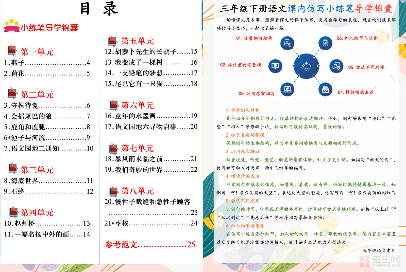 小学语文 1-4 单元仿写小练笔(三年级下册)同步部编版三年级下册语文教材前四单元内容,结合课文重点句式与段落特点设计练习,涵盖句子仿写、词语运用、看图仿写、简单段落仿写、事物描写仿写等基础训练,贴合三年级起步写作要求。内容浅显易懂、循序渐进,重点培养语句通顺表达、观察能力、用词规范和基础写作逻辑,帮助孩子积累优美语句,解决写作无从下笔的问题。适合三年级学生课后日常练笔、单元习作准备、写作基础夯实、课堂拓展练习,轻松提升语文表达与写作能力。请添加微信 18617049513 进专属群,获取更多免费资源!