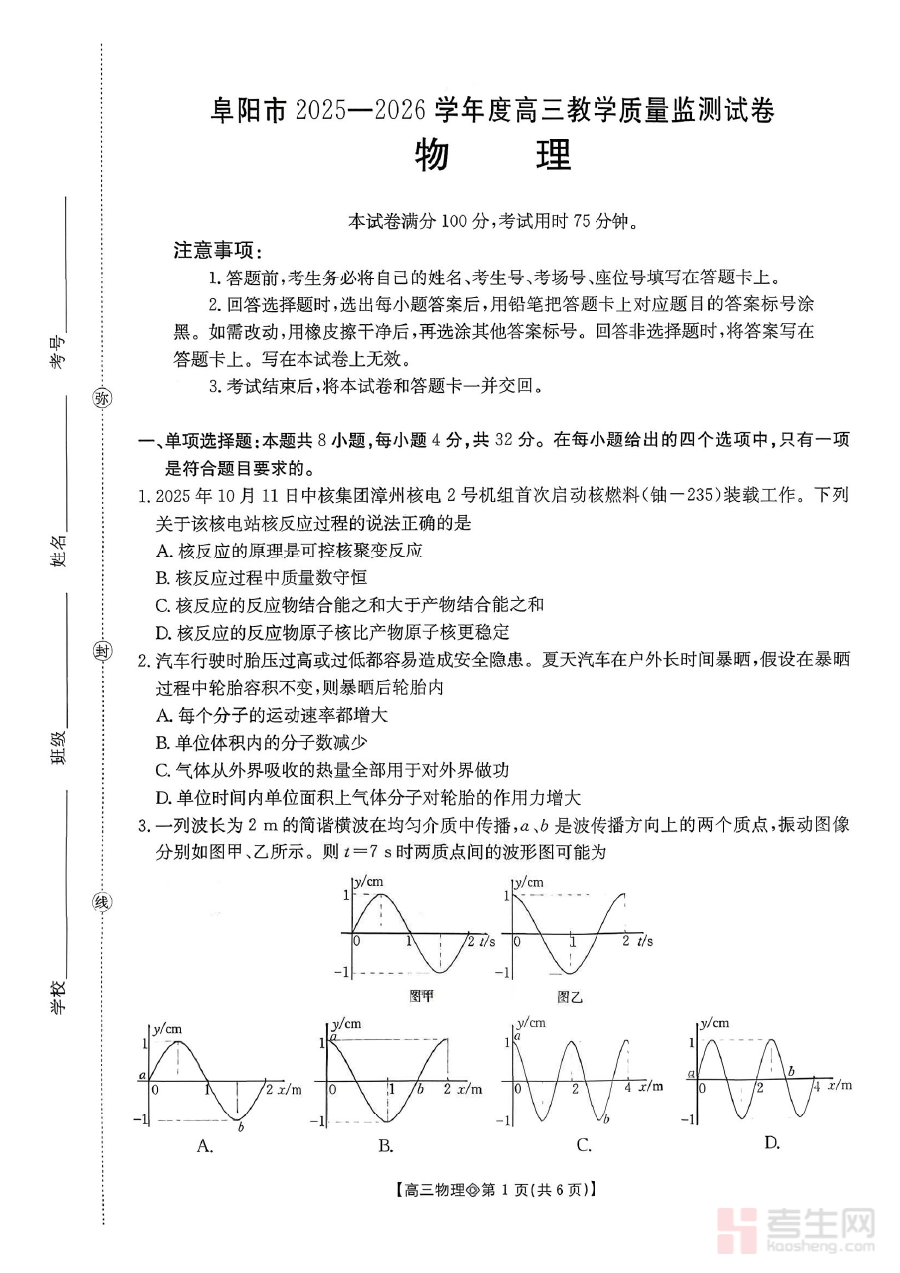 该资料主要适用于安徽省阜阳市2025-2026学年的高三学生、物理教师及相关教育管理工作者。对于学生,通过练习试题并对照答案分析,能提升物理知识应用能力与应试技巧;对于教师,可借助资料优化备考指导策略,增强教学针对性;对于教育工作者,该资料能为区域物理教学质量评估提供数据支撑,助力整体教学质量提升。