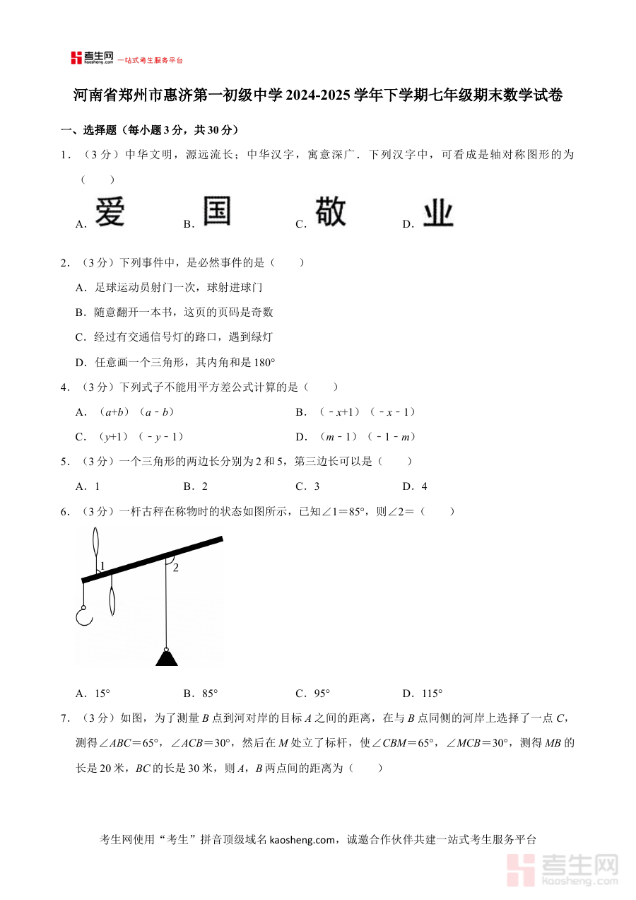 《河南省郑州市惠济第一初级中学2024-2025学年下学期七年级期末数学试卷》是河南省郑州市惠济区第一初级中学针对七年级学生设计的2024-2025学年下学期期末数学学科检测资料,属于校内专属的期末备考资源,旨在帮助学生提前熟悉该校期末数学考试的考查范围与整体结构,为期末复习提供明确的方向指引。
