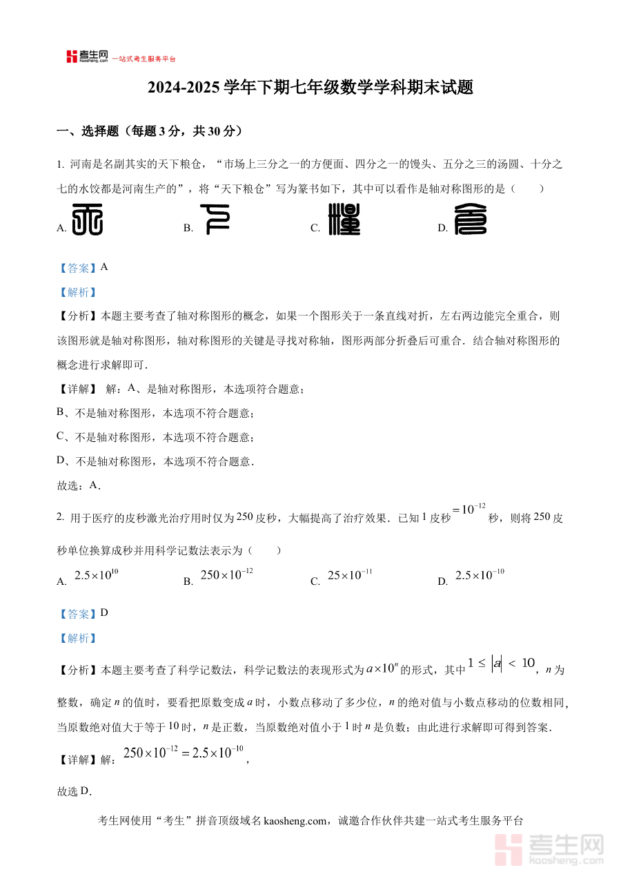《精品解析:河南省郑州市外国语集团校2024-2025学年下学期期末考试七年级数学试题(解析版)》是针对河南省郑州市外国语集团校在2024-2025学年下学期组织的七年级数学期末考试所编制的专业备考资料。该资料紧密贴合该集团校的教学进度与期末检测标准,聚焦七年级下学期数学学科的核心考查方向,为使用者提供与本次期末考试直接关联的系统性支持。