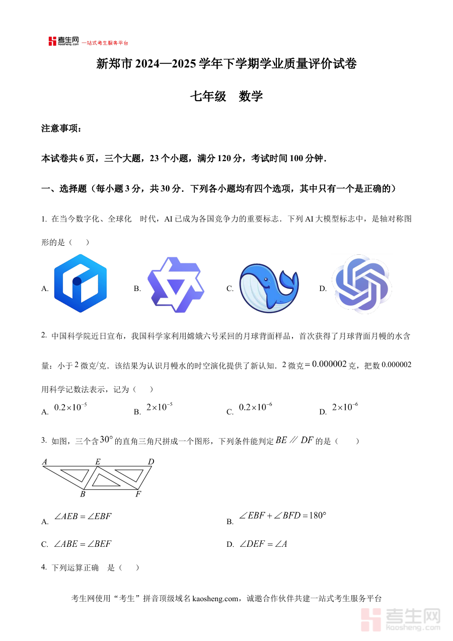 《精品解析:河南省郑州市新郑市2024-2025学年七年级下学期6月期末数学试题(原卷版)》是针对河南省郑州市新郑市2024-2025学年七年级下学期6月期末数学考试的备考资料,精准匹配该地区该学年该阶段的数学学科期末检测需求,为使用者提供贴合本地教学进度与考试要求的原卷内容参考。