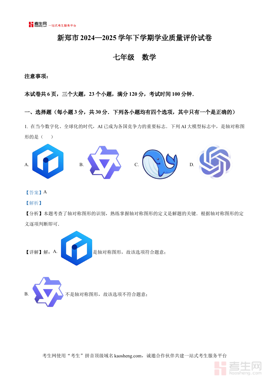 《精品解析:河南省郑州市新郑市2024-2025学年七年级下学期6月期末数学试题(解析版)》是针对河南省郑州市新郑市2024-2025学年七年级下学期6月期末数学考试的专业备考资料,精准对应该地区该学年该阶段的数学期末检测场景,为使用者提供与本地考试实际需求高度匹配的参考内容。