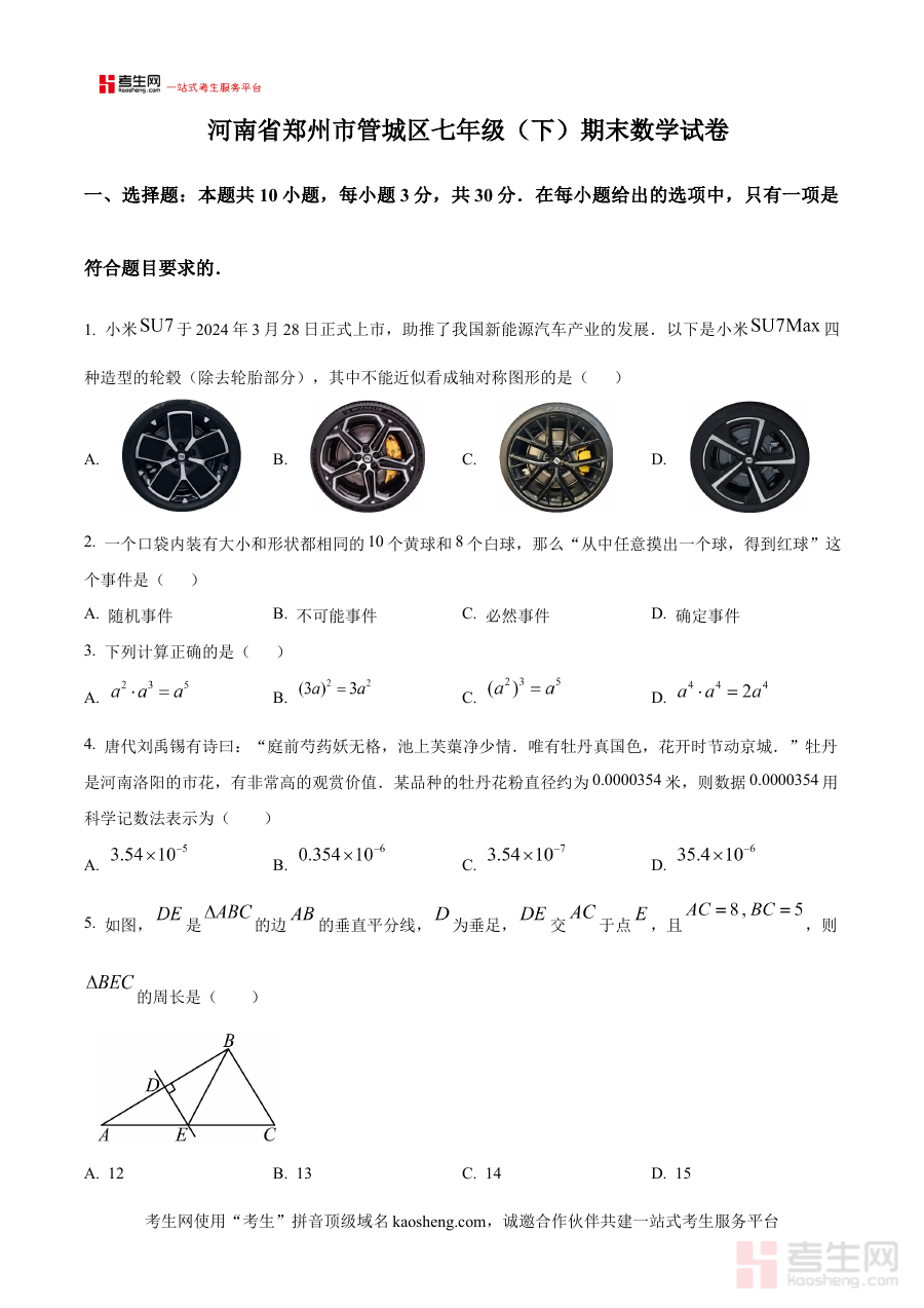 《精品解析:河南省郑州市管城区2024-2025学年七年级下学期期末数学试卷(原卷版)》是面向河南省郑州市管城区2024-2025学年七年级下学期数学期末考试的专项备考资料,精准匹配该区域该学年七年级下学期数学学科的期末测评场景,为使用者提供贴合本地教学进度与测评要求的内容载体。