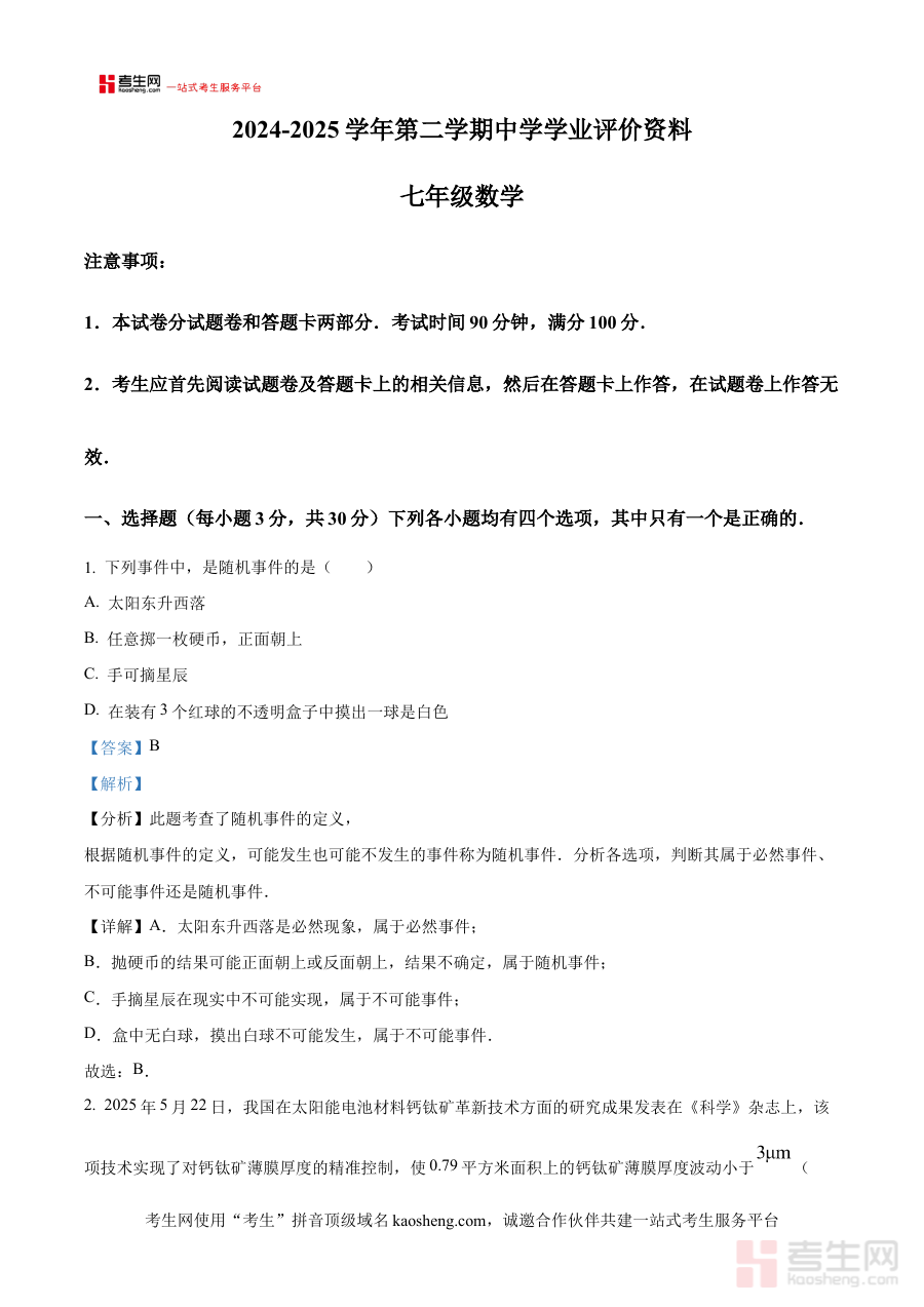 本资料适用于河南省郑州市金水区2024-2025学年七年级学生、数学教师及学生家长,对于学生而言可作为期末复习的重要参考工具,帮助其熟悉考试形式与要求;对于教师和家长,则能借助解析内容更好地指导学生进行阶段检测与备考规划,具有较高的实用价值。