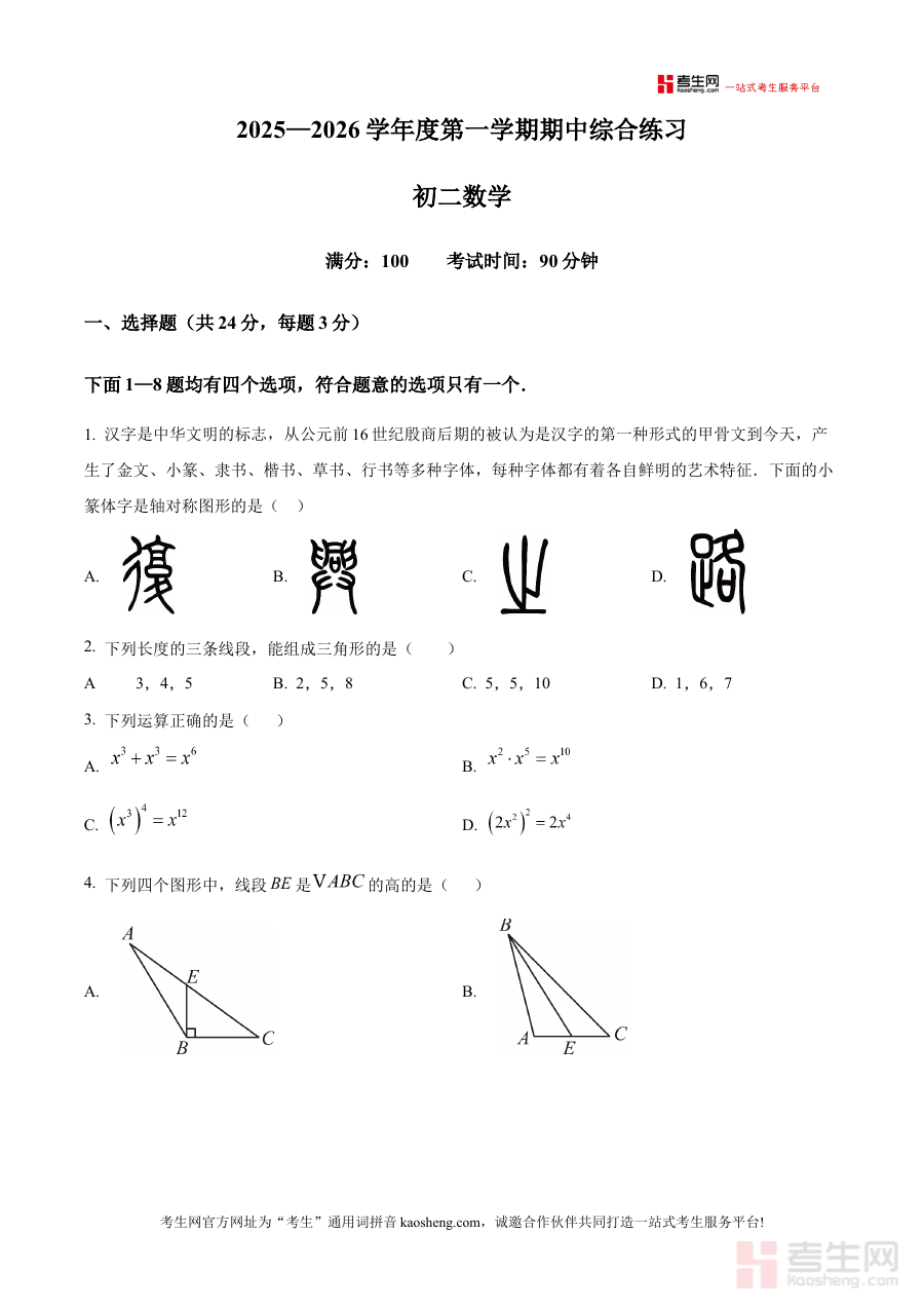《精品解析:北京市清华大学附属中学朝阳学校2025-2026学年八年级上学期期中数学试题(原卷版)》是适配北京市清华大学附属中学朝阳学校2025-2026学年八年级上学期期中数学考试的备考资料,紧密贴合该学年该阶段的数学教学进度与考试标准,为使用者提供与实际考试形式完全一致的原卷内容参考。