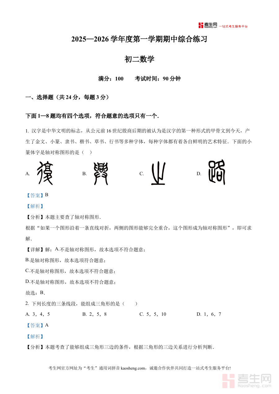 《精品解析:北京市清华大学附属中学朝阳学校2025-2026学年八年级上学期期中数学试题(解析版)》是针对北京市清华大学附属中学朝阳学校2025-2026学年八年级上学期期中数学考试的专项备考资料,精准匹配该校该阶段数学学科的期中检测场景,为学生提供贴合校考实际的学习辅助资源。