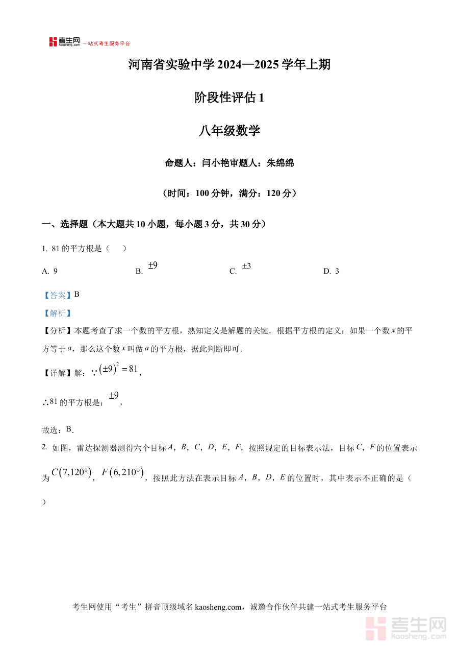 此资料主要适用于河南省实验中学八年级学生,也适合同地区同年级有相似月考需求的学生群体;其解析部分能够帮助学生深化对知识点的理解与运用能力,培养规范答题的习惯,对提升阶段检测成绩、规划后续学习路径具有重要价值,是阶段学习与备考过程中不可或缺的辅助资源。