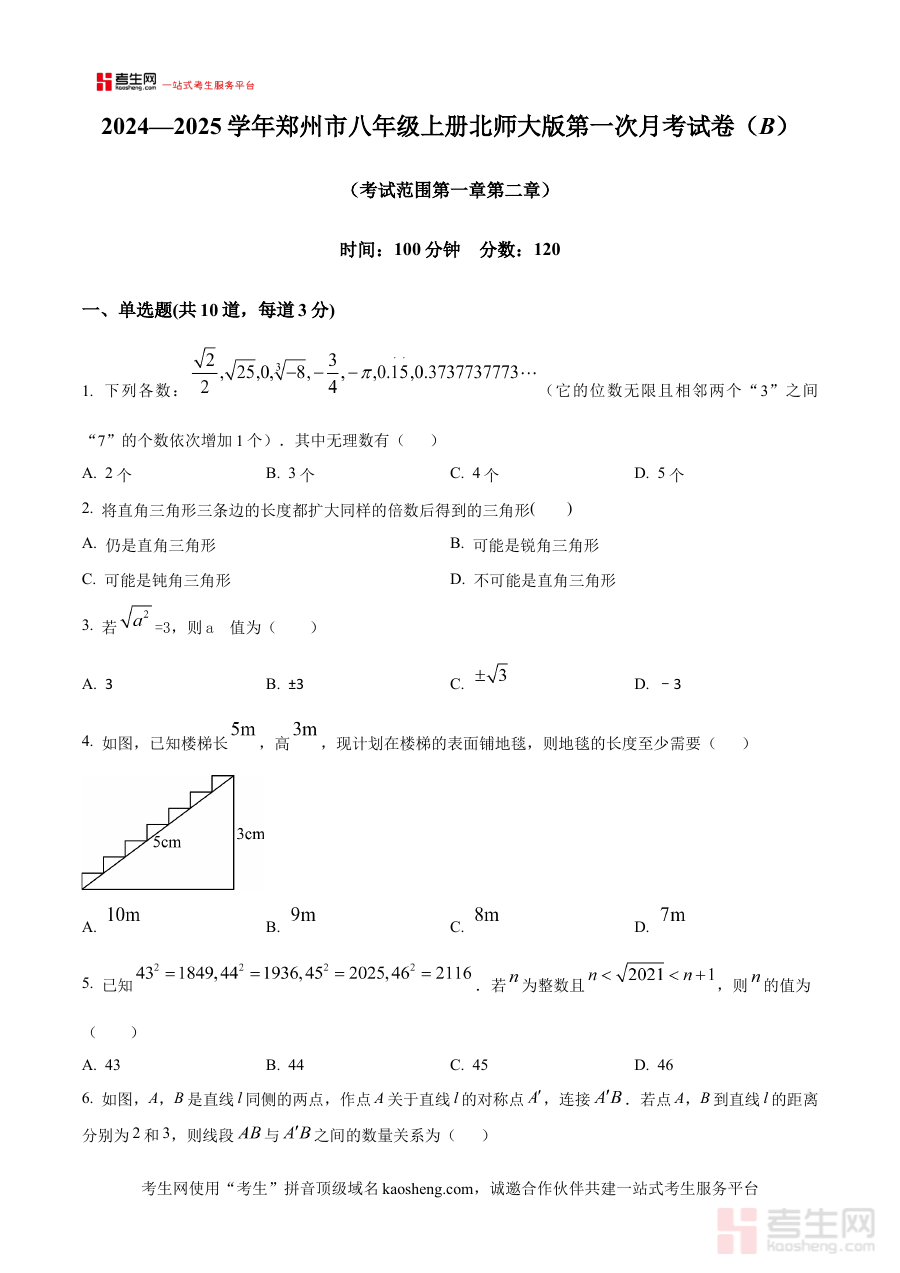 《精品解析:河南省郑州市2024--2025学年北师大版八年级数学上册第一次月考试卷(B)(原卷版)》是面向河南省郑州市2024至2025学年八年级上学期数学学科的标准化月度检测备考资料,其依托北师大版教材的知识框架,结合该地区同期教学进度与考试命题特点编制而成,能够准确体现该阶段数学学科的阶段性考查目标与要求,为使用者提供与本地教学实际高度契合的检测素材。