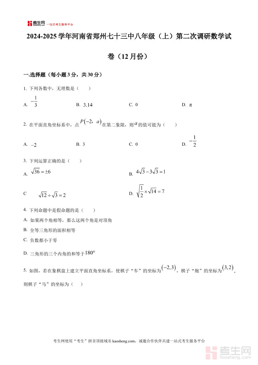 《精品解析:河南省郑州市第七十三中学2024-2025学年上学期12月第二次调研八年级数学试卷(原卷版)》是针对河南省郑州市第七十三中学2024-2025学年上学期八年级数学学科的阶段性调研考试资料,聚焦该学年上学期12月第二次调研考试的原卷内容,为相关备考提供直接参考依据。
