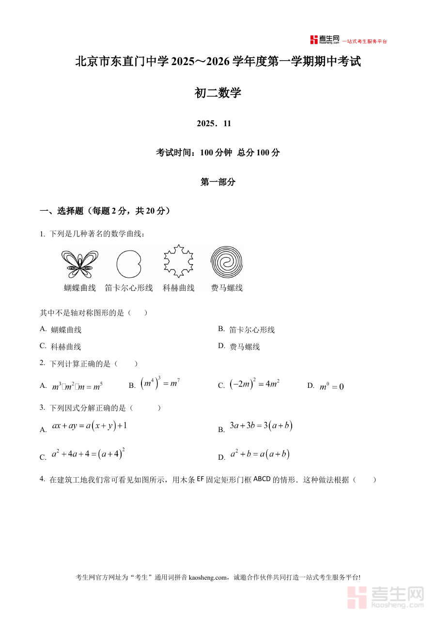 《精品解析:北京市东直门中学2025-2026学年八年级上学期期中数学试卷(原卷版)》是专门针对北京市东直门中学2025至2026学年八年级学生打造的期中数学考试配套备考资料,紧密贴合该学年上学期的数学学习进度与期中检测目标,提供与学校本次期中考试完全一致的原卷内容,帮助使用者直观了解考试的题型分布、题量设置及命题风格,为后续的复习与备考奠定基础。