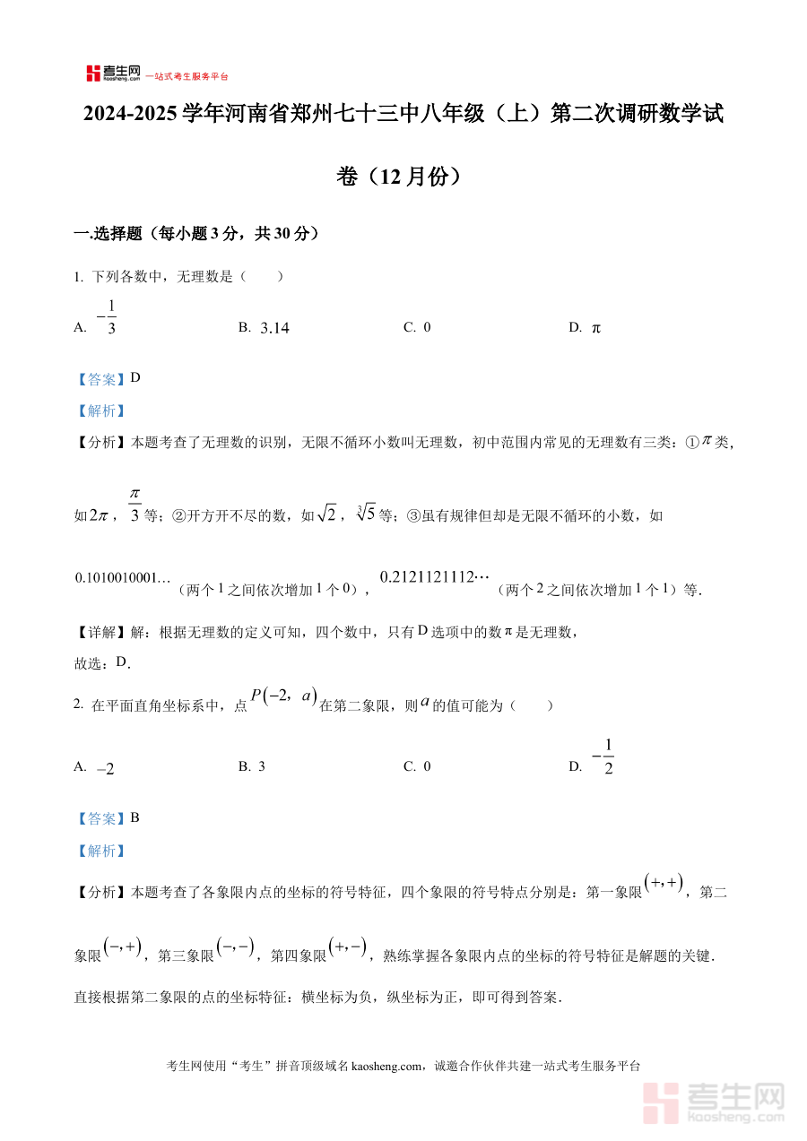 本资料适用于河南省郑州市第七十三中学八年级学生及关注该阶段数学教学的教师群体,其解析内容能辅助学生巩固阶段知识、提升应试能力,同时为教师教学反馈与指导提供参考,具有较强的阶段检测与备考规划价值。