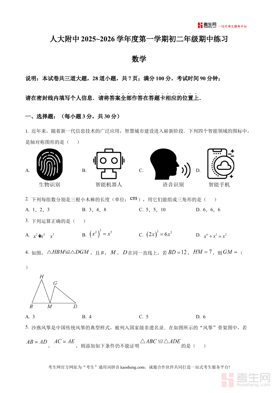 本资料适用于北京市中国人民大学附属中学2025-2026学年上学期的八年级学生、数学教师及学生家长。对于学生而言,通过原卷练习可熟悉考试形式与节奏;对于教师,可作为期中复习阶段的参考素材;对于家长,则能更好地配合学校教学进行家庭辅导,共同促进学生数学学科能力的稳步提升。