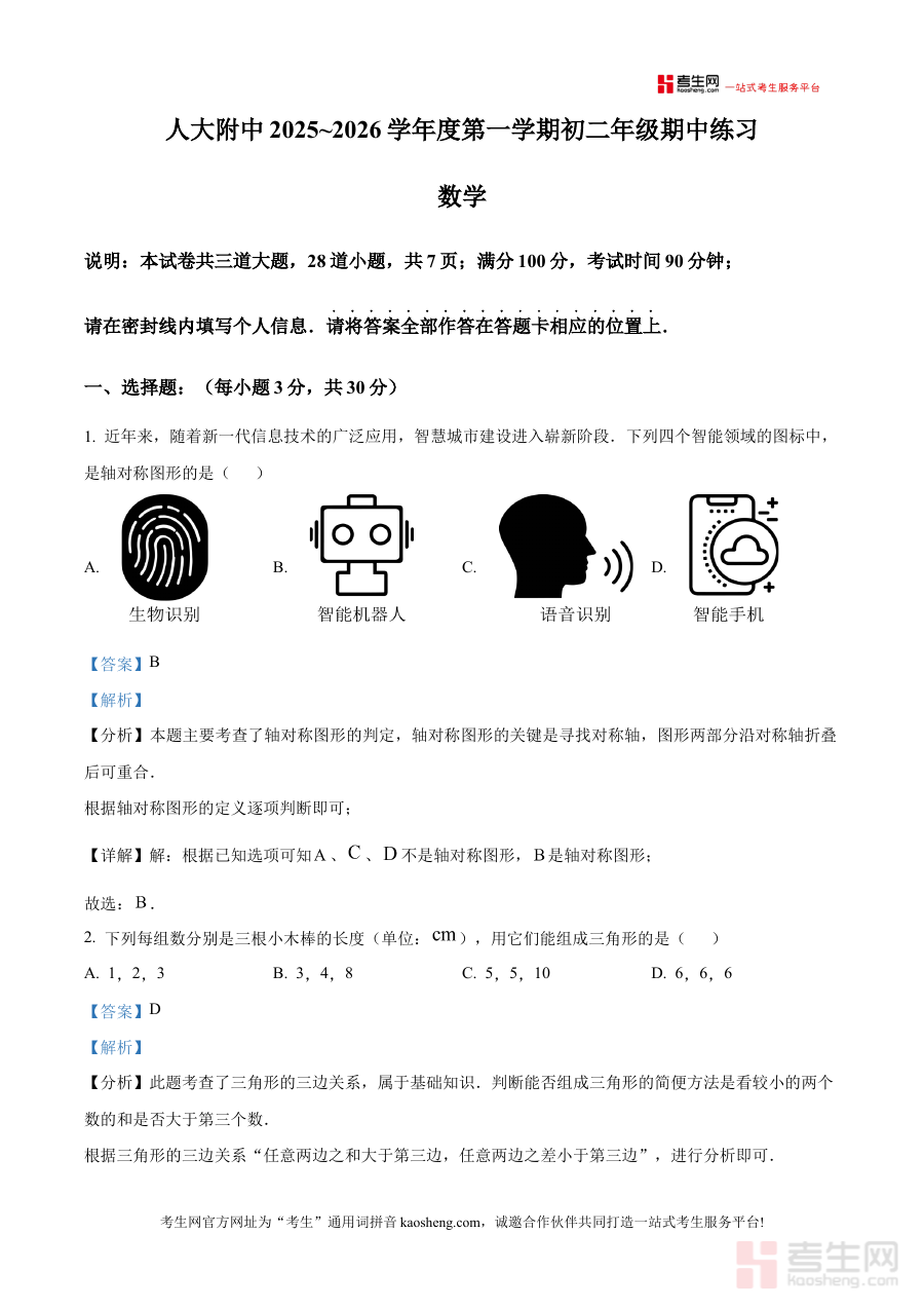 《精品解析:北京市中国人民大学附属中学2025-2026学年上学期八年级数学期中试卷(解析版)》是针对北京市中国人民大学附属中学2025-2026学年上学期八年级数学期中考试的配套备考资料,聚焦该阶段数学学科的期中检测需求,为学生提供贴合校考实际的复习参考依据。