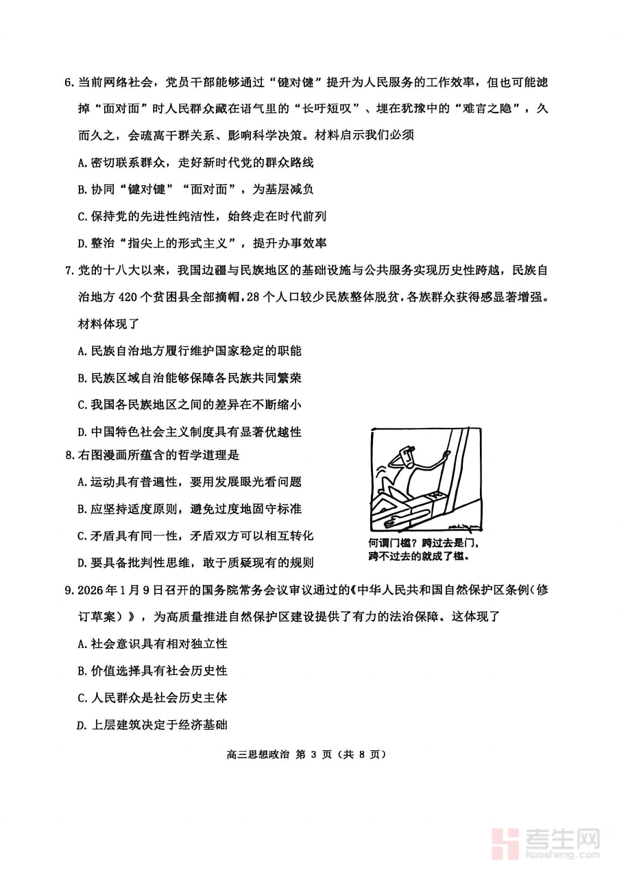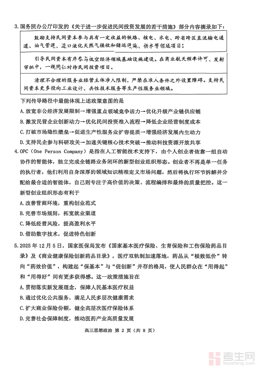 此资料适用于2026届苏北四市的高三政治教师、学生及相关教育教研人员。对于学生,完成试卷并对照答案进行复盘能及时巩固已学知识、弥补知识漏洞;对于教师,可借助该资料评估阶段教学效果、优化教学方案与复习计划;教研人员则可通过分析试卷内容把握区域备考动态,为教学指导提供数据支撑,整体具有显著的阶段检测与备考规划价值。