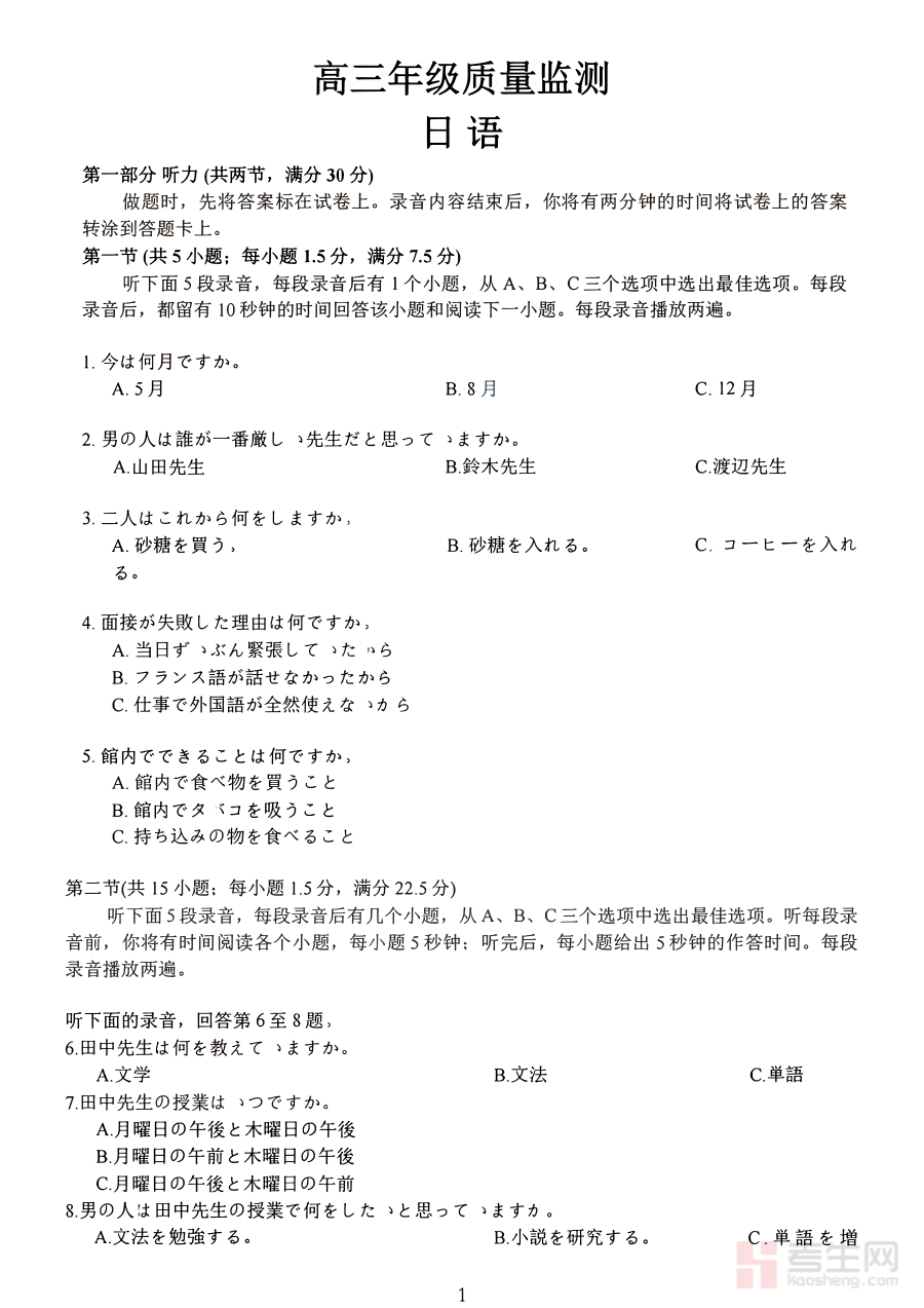 这份资料的核心用途在于辅助高三日语考生进行一轮复习阶段的学情诊断,帮助考生清晰认知自身在日语知识体系构建、答题思路形成等方面的优势与不足;同时也为教师提供了区域内学生整体学习状况的参考依据,便于教师针对性调整教学计划与复习重点;此外,作为模拟考试资料,其内容设置可助力考生明确备考方向,优化后续学习规划,提升复习效率。