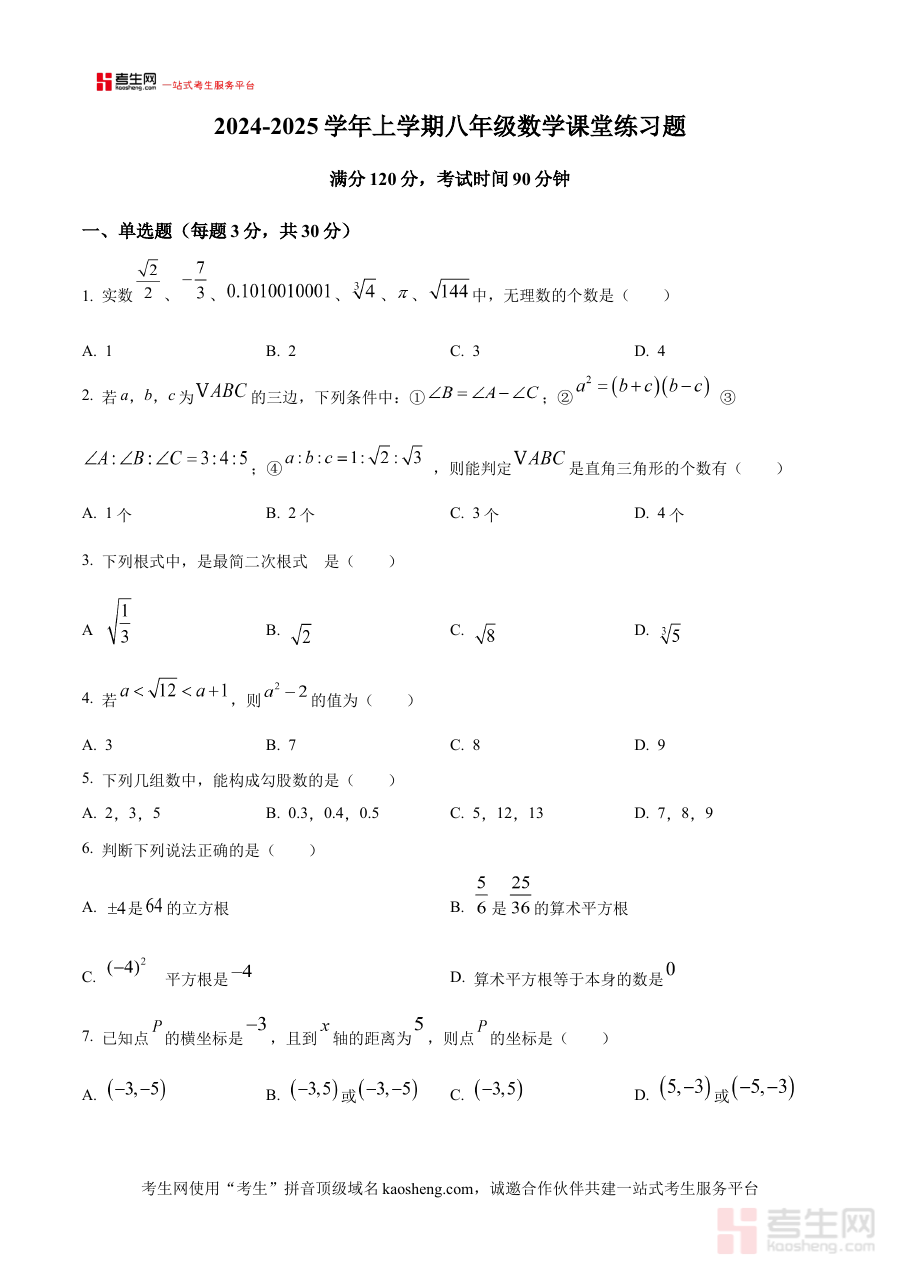 该资料可用于八年级学生进行数学学科的阶段学情诊断,帮助师生明确当前学习阶段的知识掌握情况,为后续的备考规划提供依据,同时也可作为阶段检测的参考材料,辅助教学与学习方向的调整。