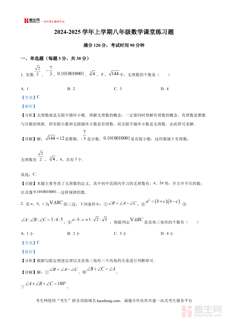 《精品解析:河南省郑州市管城回族区外国语学校2024--2025学年上学期八年级数学10月月考试卷(解析版)》是对应河南省郑州市管城回族区外国语学校2024至2025学年上学期八年级数学学科10月份月度考试的专项备考资料。该资料以学校当月数学月考试卷为核心载体,配套详细解析内容,为使用者提供与校内考试直接关联的学习辅助支持。