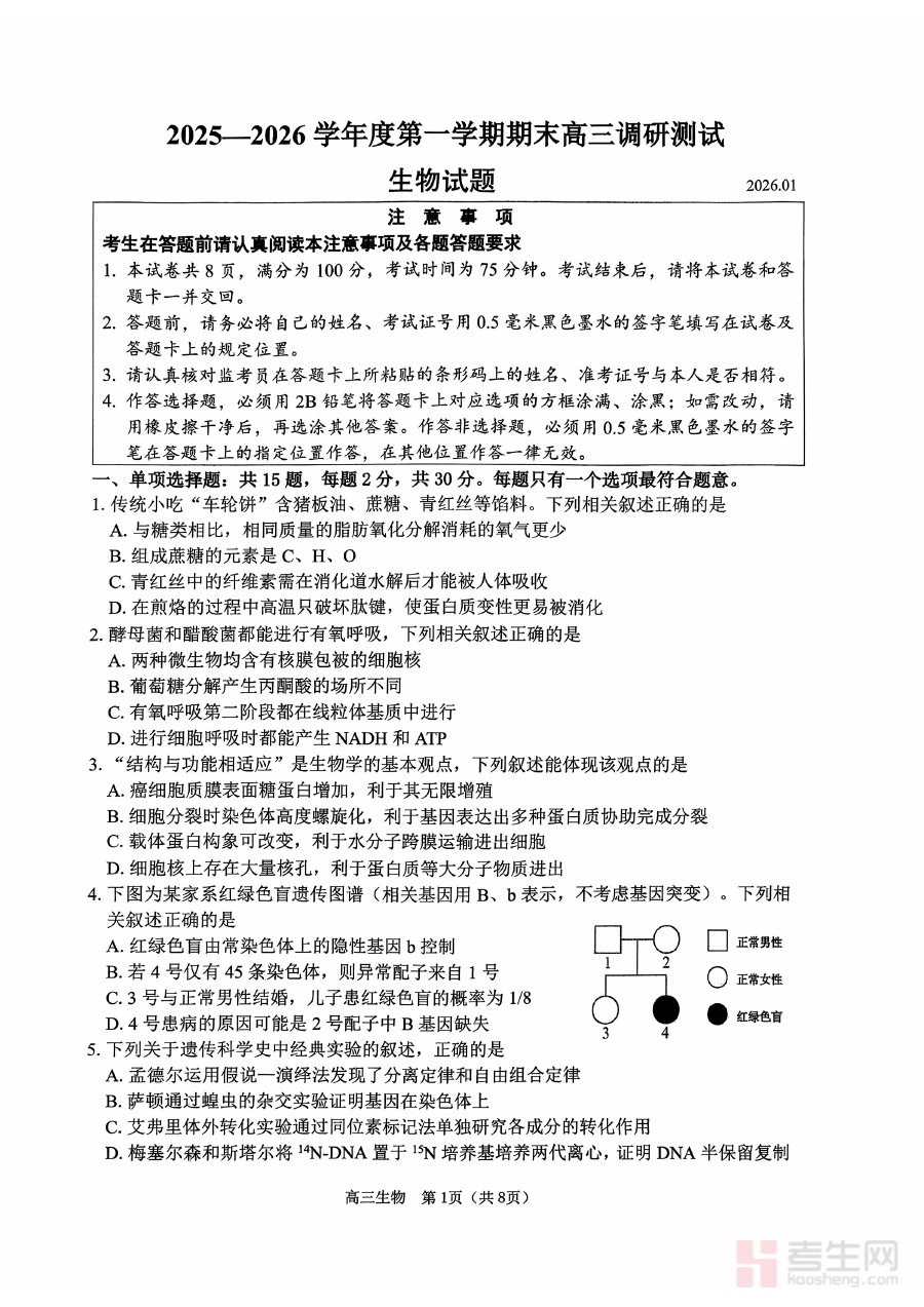 《2026届苏北四市(徐州、淮安、连云港、宿迁)一模【生物卷+答案】》是面向2026届高中毕业生推出的区域性阶段性考试资料,覆盖徐州、淮安、连云港、宿迁四个苏北核心城市,属于高考备考周期中的第一次模拟考试范畴,旨在为当地师生提供贴合区域教学进度与命题特点的生物学科备考资源,助力师生把握阶段学习方向。