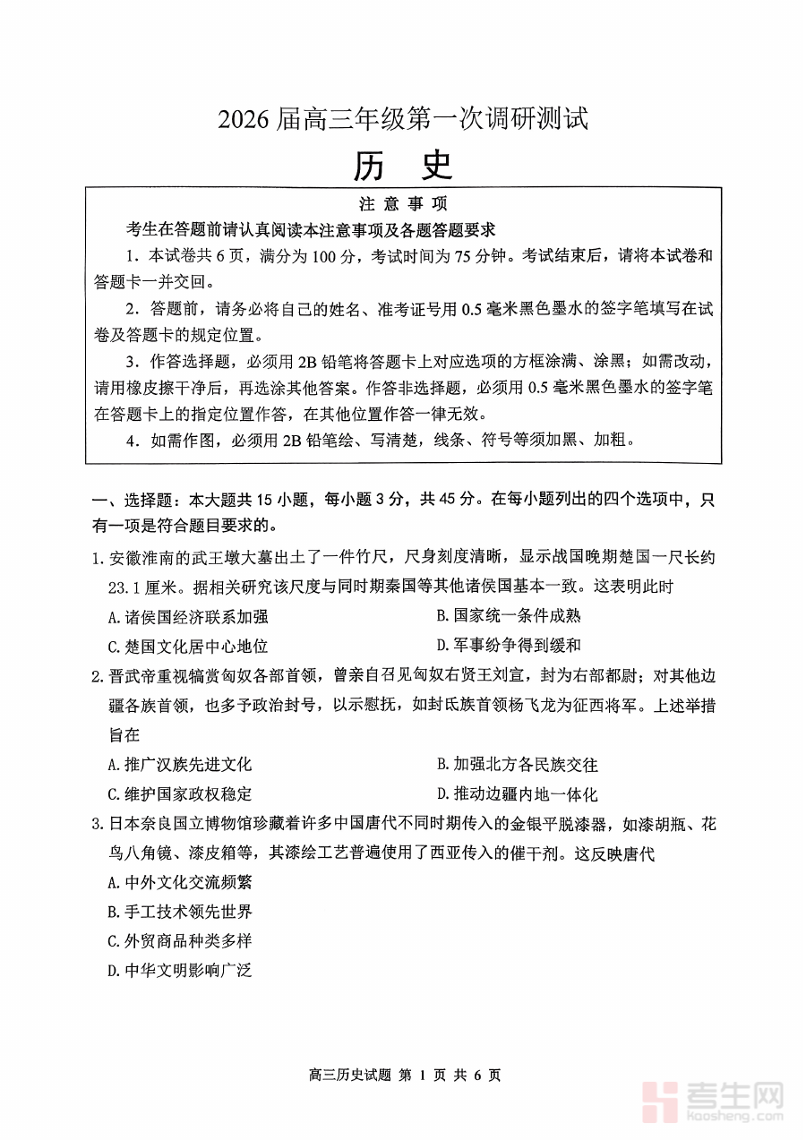 《【历史卷】苏北四市一模2601》是针对苏北四市区域内高三学生开展的历史学科第一次模拟考试相关的备考资料。该资料聚焦苏北四市历史学科的阶段性备考需求,反映了区域内历史学科教学与备考的阶段性方向,为高三师生提供了与区域联考标准相匹配的参考内容,有助于对接区域内历史学科的备考节奏和要求,是区域内高三历史备考过程中具有代表性的阶段性资料。