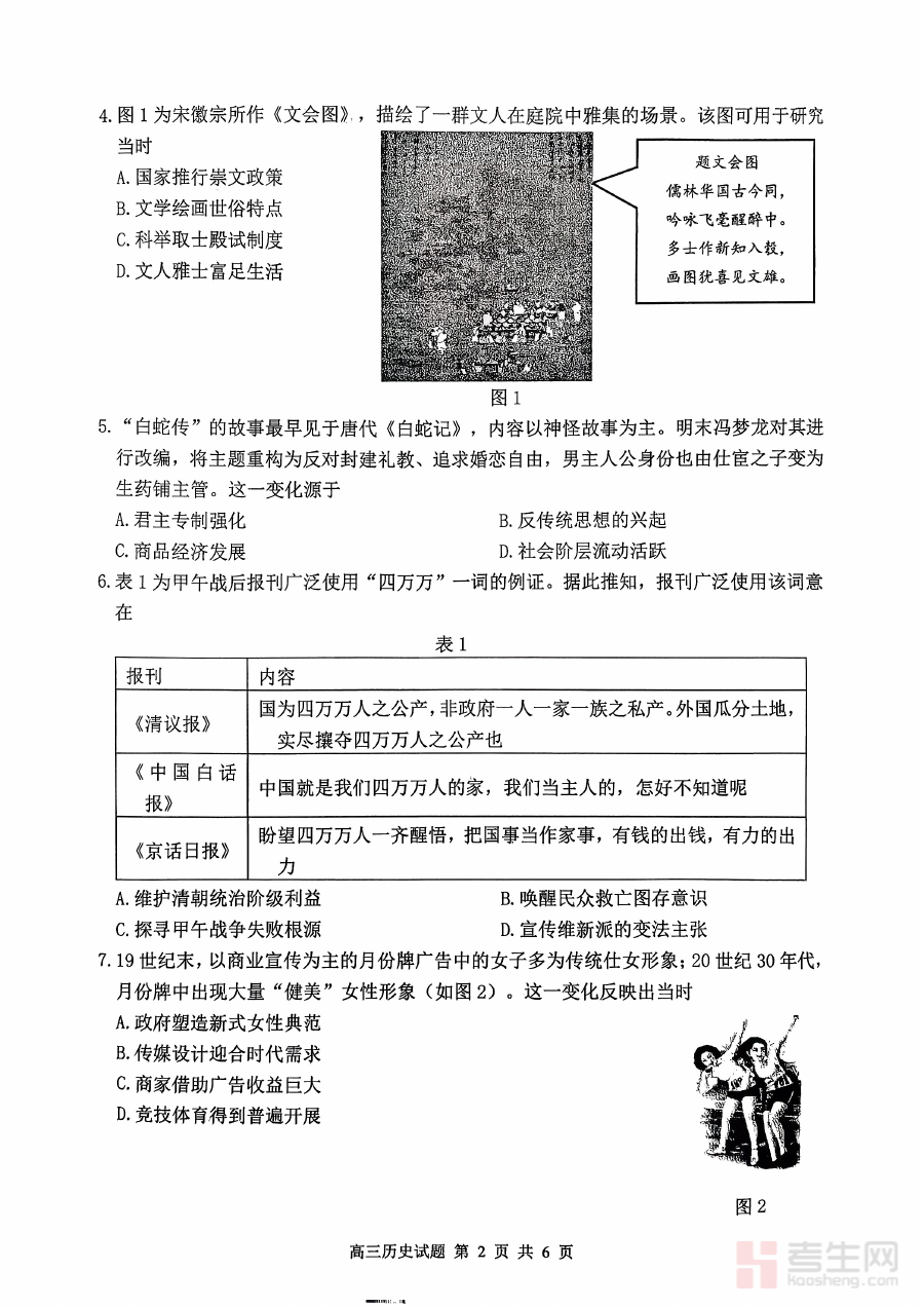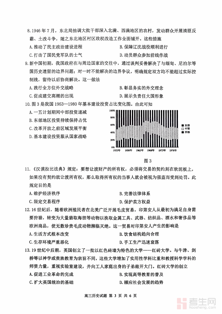 该历史卷主要用于高三历史学科的学情诊断与阶段性检测,能够帮助教师系统了解学生在历史知识体系构建、学科能力应用等方面的实际情况,为后续教学策略调整和复习计划优化提供客观依据;同时也可作为学生自我评估的工具,让学生清晰认知自身在历史学习中的优势与短板,为个性化备考规划提供数据支持,助力学生明确后续复习的重点方向。