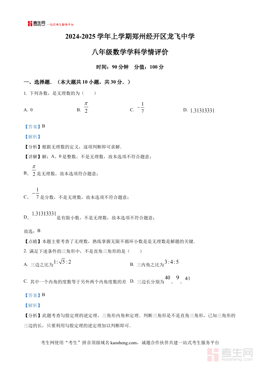 《精品解析:河南省郑州经济技术开发区龙飞中学2024--2025学年上学期八年级数学第一次月考试卷(解析版)》是针对河南省郑州经济技术开发区龙飞中学特定学年学期、特定年级学科及特定考试类型的专项备考资料,明确覆盖了2024-2025学年上学期八年级数学第一次月考的相关内容,为该阶段的数学学习提供了直接且精准的参考方向,帮助使用者快速定位到对应考试的核心备考需求。