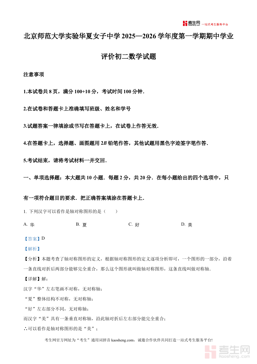 《精品解析:北京市北京师范大学实验华夏女子中学2025-2026学年八年级上学期11月期中考试数学试卷(解析版)》是针对北京市北京师范大学实验华夏女子中学在2025-2026学年八年级上学期11月举行的期中考试数学科目的配套备考资料,包含该次阶段性考试试卷的详细解析内容,为考生提供与本次考试直接相关的学习支持资源,助力考生熟悉该次考试的考查方向与答题要求。