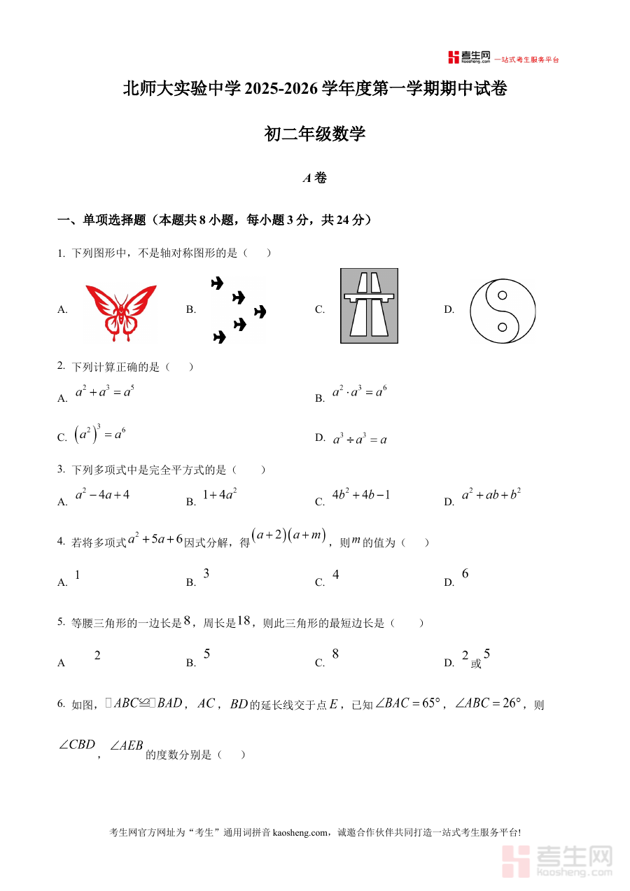 以《精品解析:北京市北京师范大学附属实验中学2025-2026学年上学期八年级数学期中试题(原卷版)》为核心的资料,聚焦北京市北京师范大学附属实验中学2025至2026学年第一学期的八年级数学期中测试场景,是针对该特定阶段数学学科期中考核的针对性备考资料,能够帮助使用者精准把握该学校八年级数学期中测试的命题方向与考核框架。