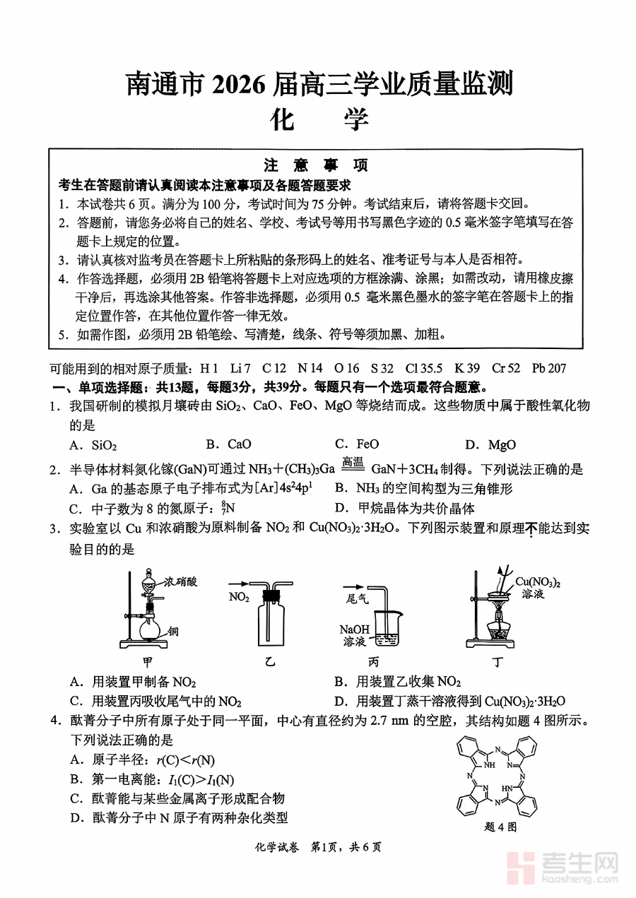 《江苏省南通市2026届高三上学期学业质量监测化学试题(含答案)》是江苏省南通市面向2026届高三学生在第一学期开展的化学学科学业质量监测的试题及配套答案属于高三阶段关键的阶段性备考资料能够体现该地区高三化学教学的阶段性目标和学业质量评估标准为学生与教师提供契合本地教学实际的参考素材帮助师生把握阶段学习的核心方向