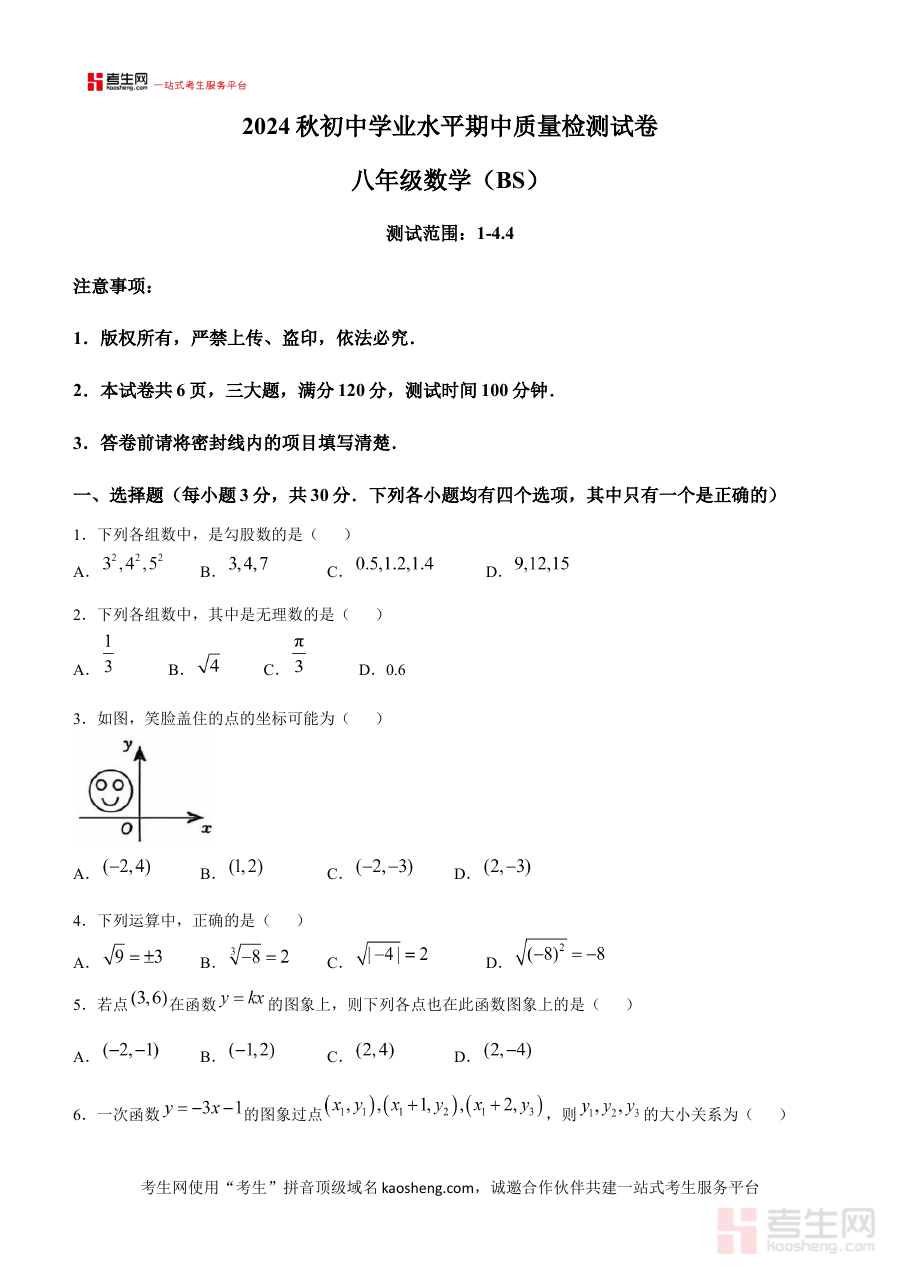 此资料可用于八年级学生进行阶段性学情诊断,帮助教师把握学生在本阶段数学知识掌握的薄弱环节与共性问题,为后续教学内容调整及学生个性化备考规划提供参考依据,同时也能辅助学校了解区域内教学质量的横向对比情况。
