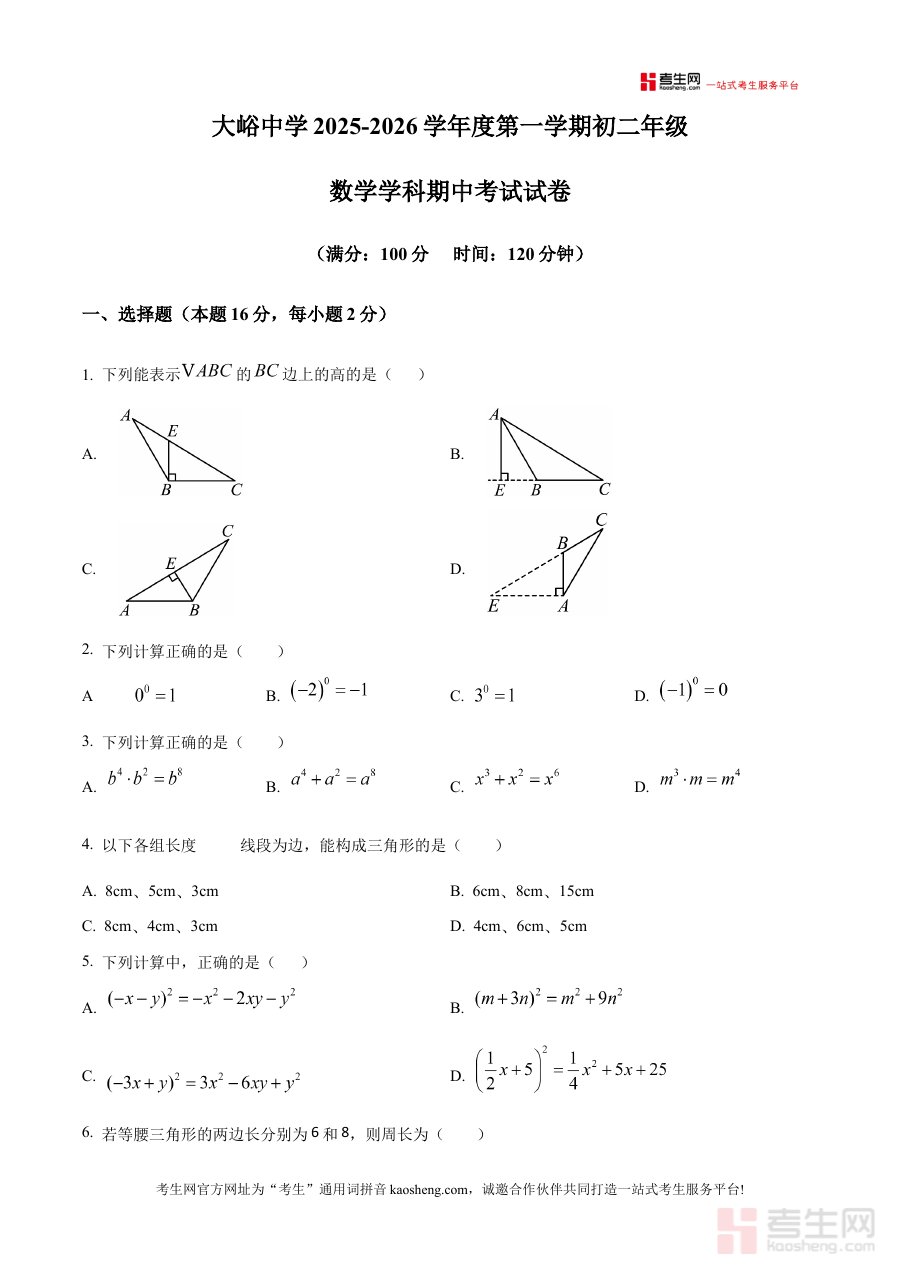 《精品解析:北京市大峪中学2025--2026学年八年级上学期期中数学试卷(原卷版)》是北京市大峪中学针对2025至2026学年八年级上学期期中数学考试推出的原卷版备考资料,涵盖该学校该阶段数学期中考查的核心方向与基本框架,能够为相关使用者提供与实际考试形式高度一致的参考载体。