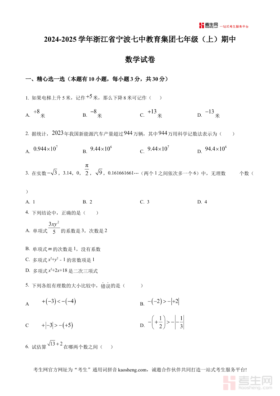 《精品解析:浙江省宁波七中教育集团2024—2025学年上学期期中考试七年级数学试卷(原卷版)》是针对浙江省宁波七中教育集团2024至2025学年上学期七年级数学期中考试的配套备考资料,聚焦该学年上半学期的阶段性学业评价需求,为相关教学活动和学习规划提供参考依据。