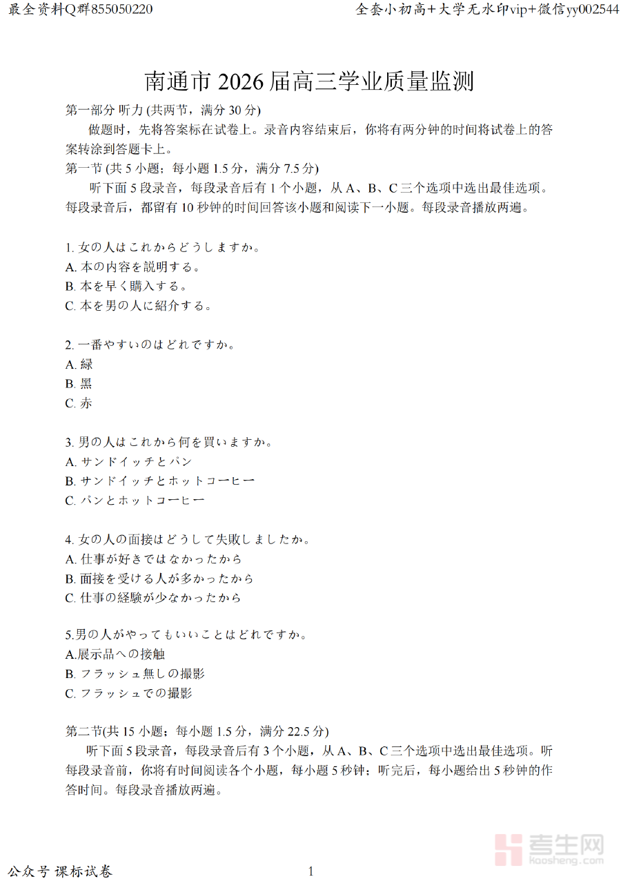 该资料主要面向江苏省南通市2026届高三日语学生,同时也适用于当地高中日语教师开展教学辅助工作。对于学生而言,通过使用这份资料进行模拟训练,能够熟悉学业质量监测的考试规范与题型特点,提升应试技巧;对于教师来说,它有助于全面了解学生的学习状况,从而更有针对性地指导学生备考,共同促进高三日语学科复习效率的提升。