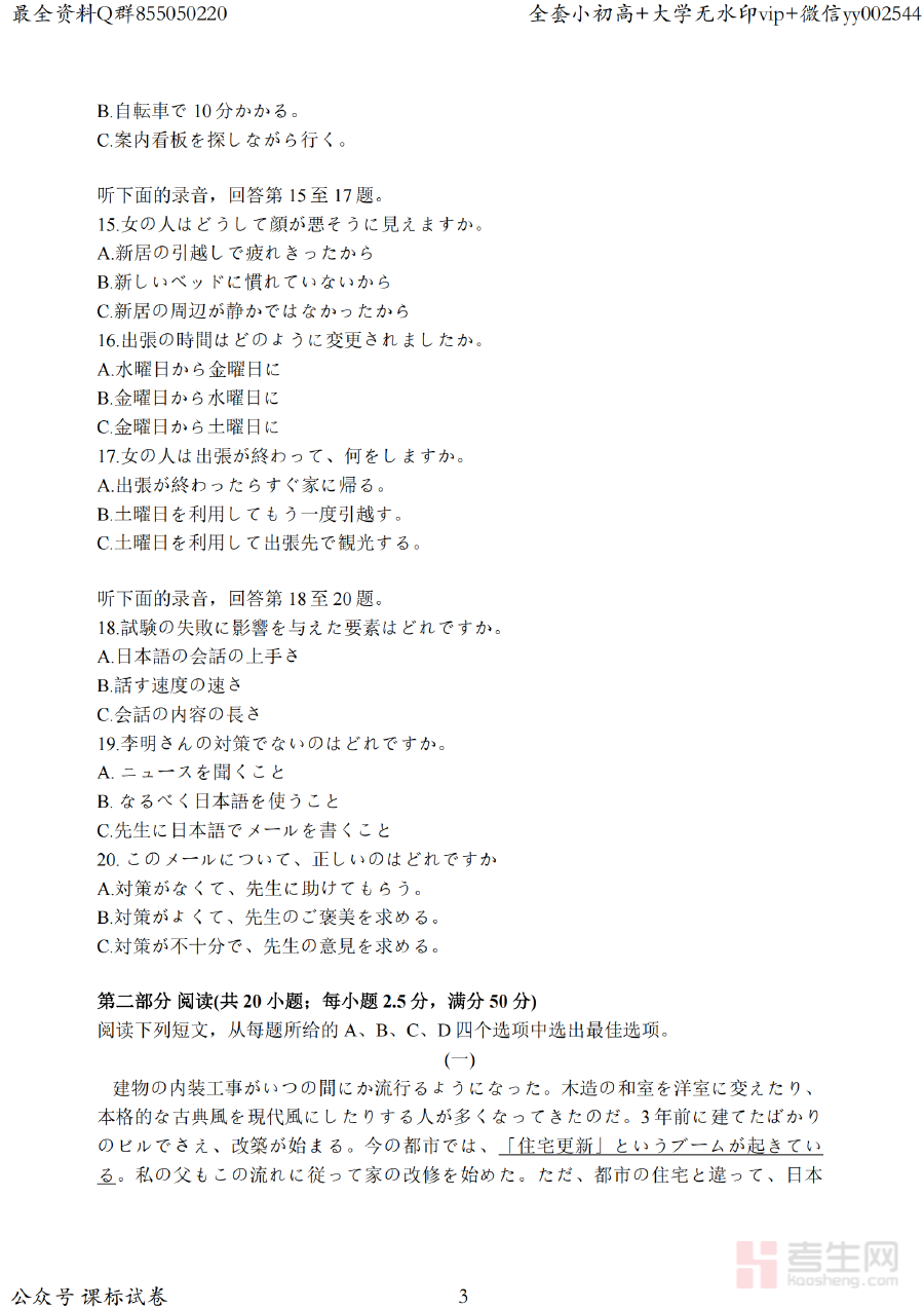 这份资料可有效用于高三日语学习者的阶段学情诊断,帮助学生精准识别自身知识掌握的薄弱点与优势领域;其附带的答案部分能够支持学生开展自主评估,为制定个性化备考规划提供依据;同时,它也可作为学校或教师开展阶段性教学效果检测与分析的重要素材,助力教学策略的优化调整。